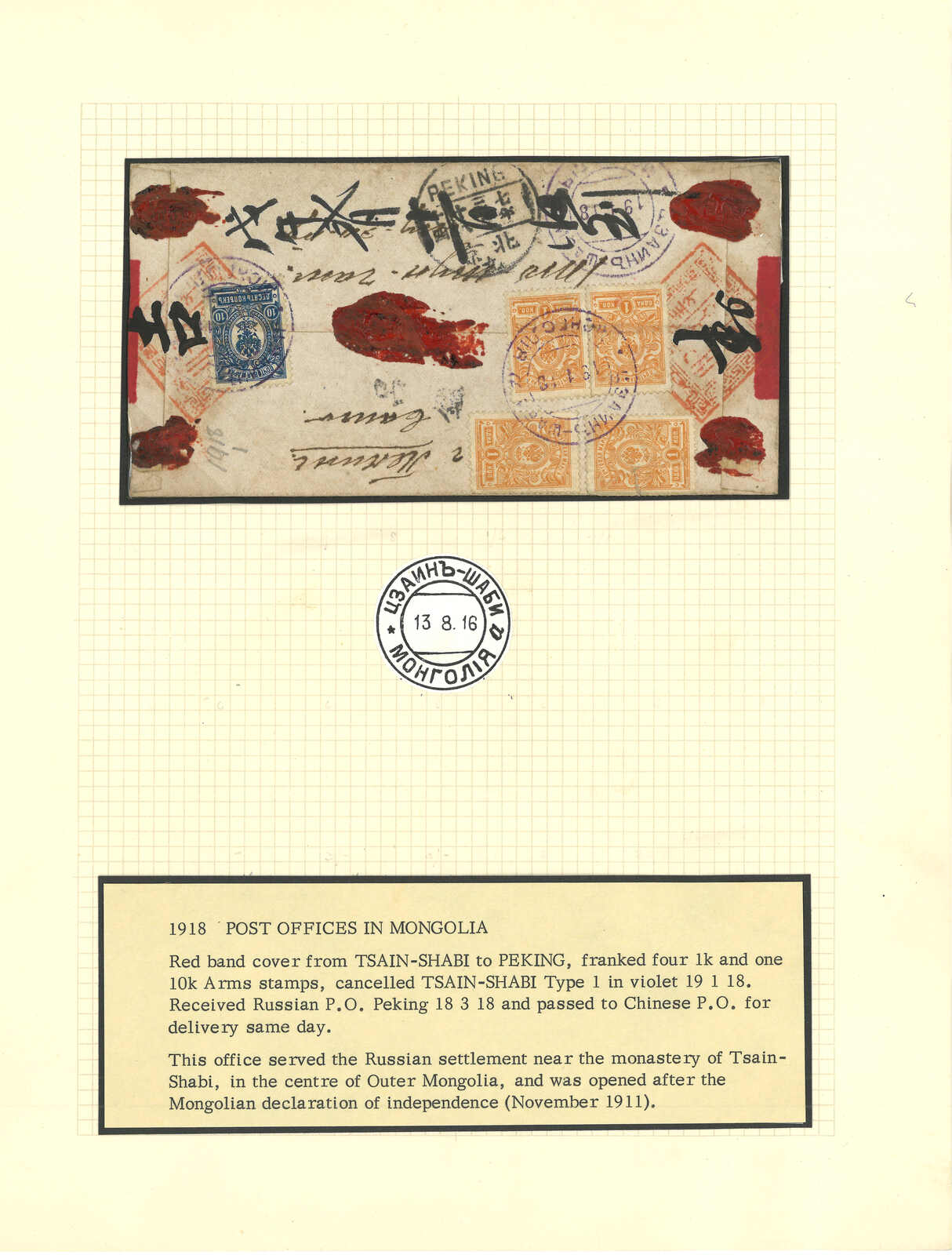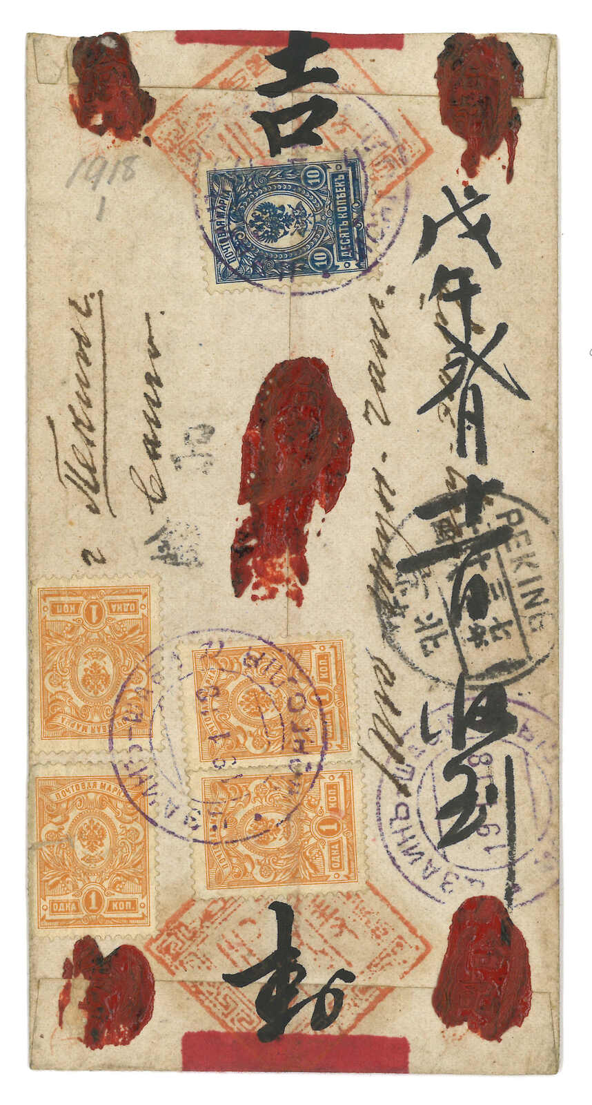 965 image1918 Tsain-Shabi (1.19 Julian calendar) to Peking. Red band cover, f.w. Russian Coat of Arms 4x 1k + 10k stamps, tied by Tsain-Shabi a Russian PO cds 3.5. Delay probably caused by chaos after the Russian Revolution. Delivered by Chinese PO 3.18. Only 23 covers from Tsain-Shabi Russian PO are recorded. Ex. Casey.