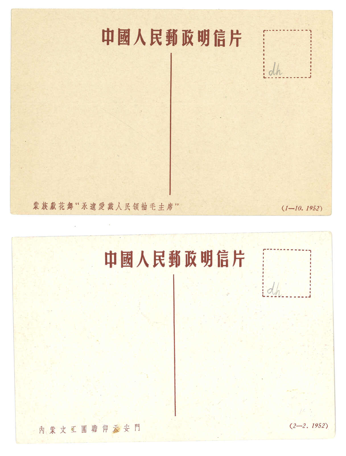 1255 cover image1952 a pair of People's Post of China PPC featuring Inner Mongolian people. Both unused. Very Fine.