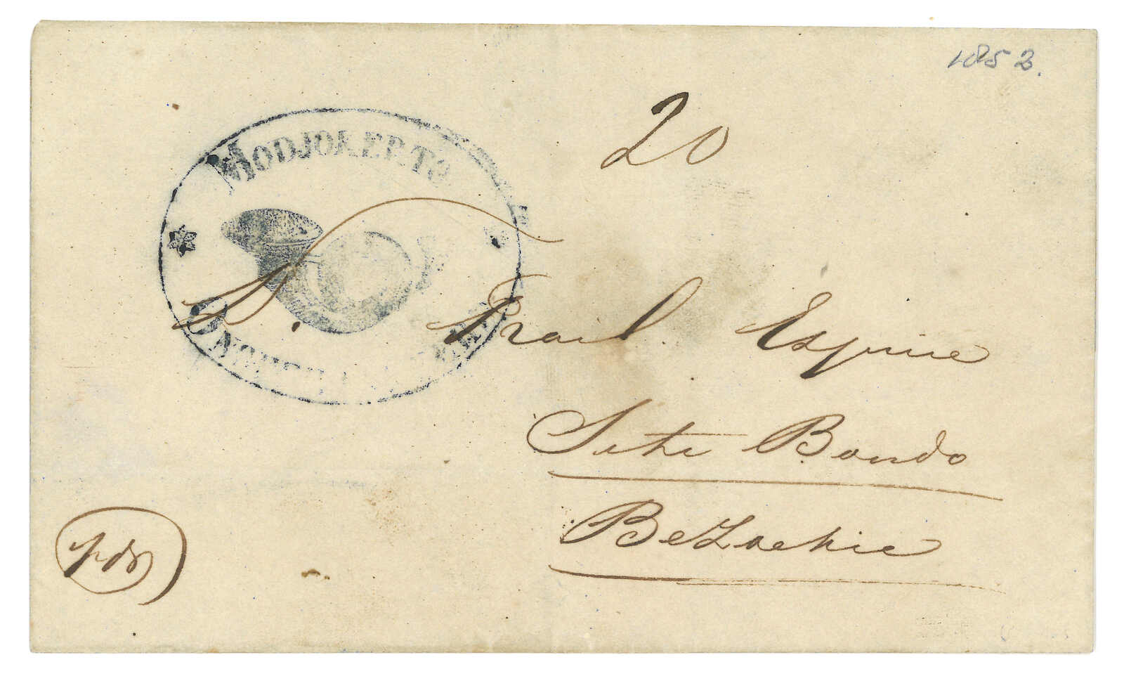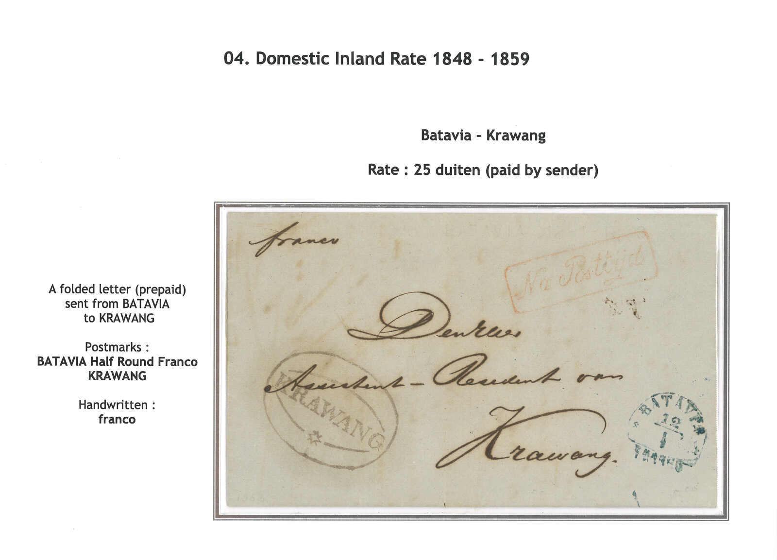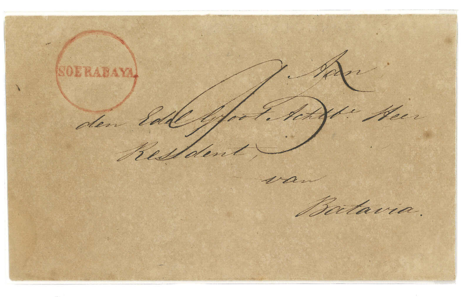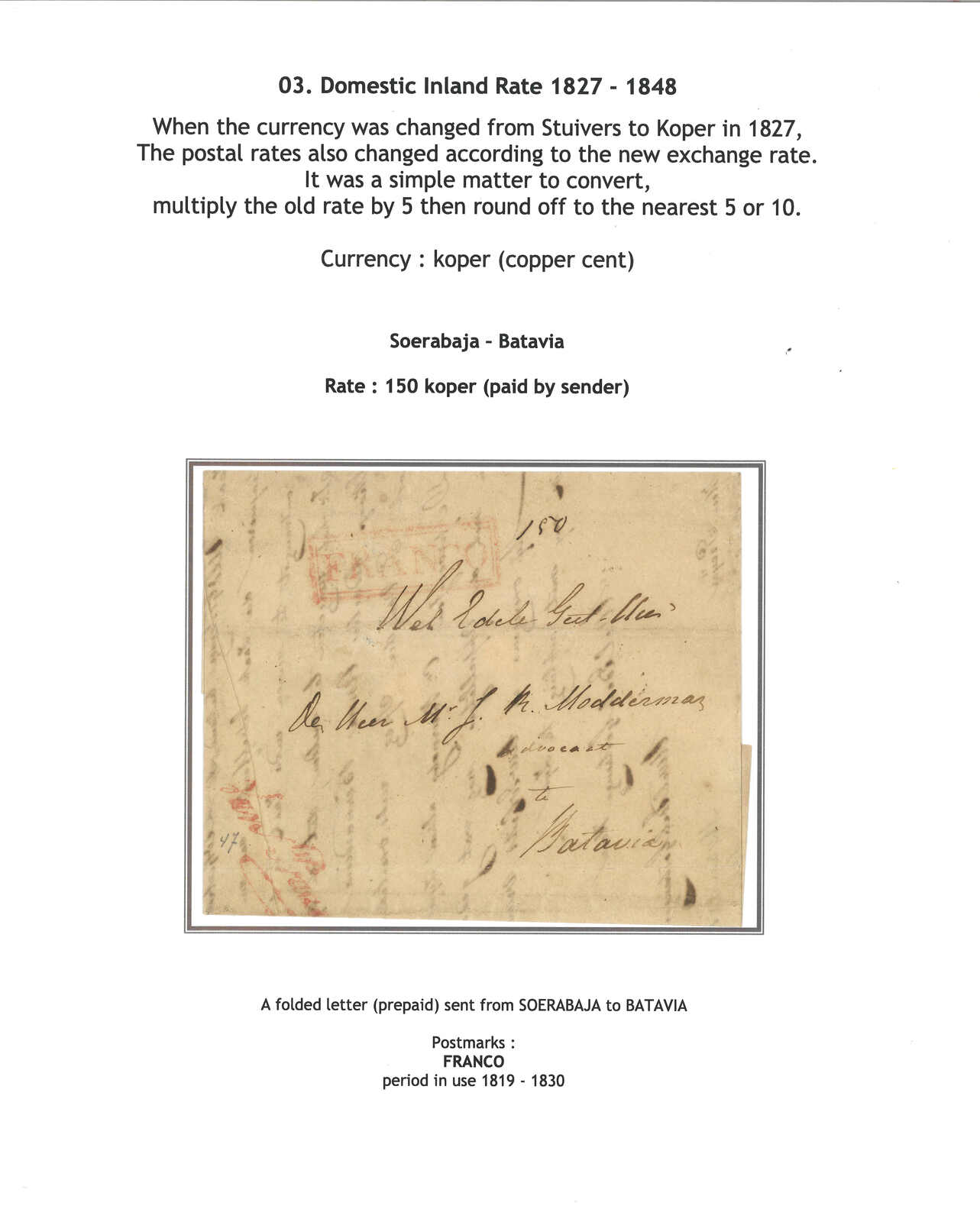 約1830年代泗水寄巴達維亞。郵簡,寫有郵資“150”,鈐“FRANCO”橫戳。(Image 1)