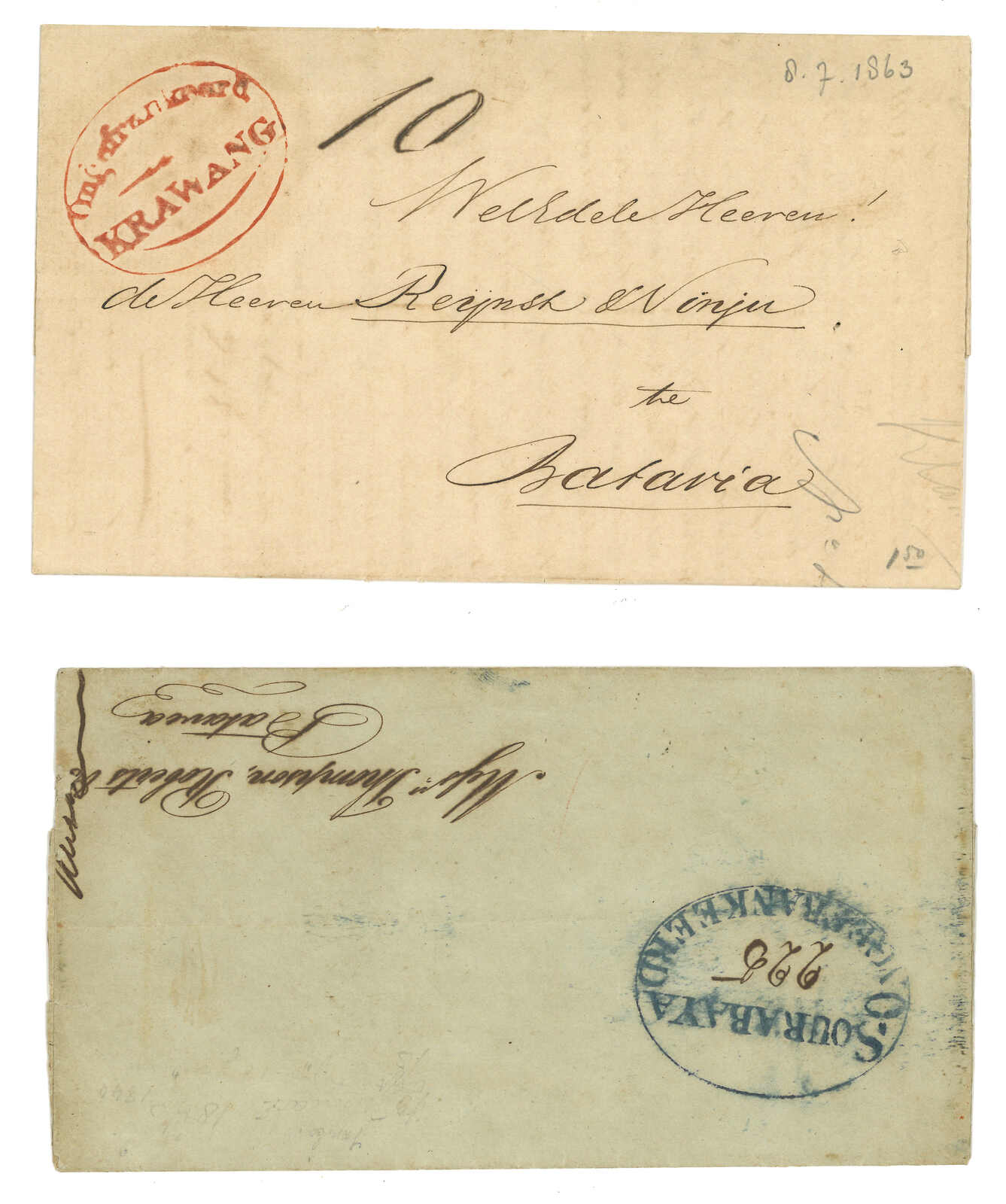 3838 cover image19th Century a group of 5 Dutch East Indies entire letters, mostly addressing to Batavia, applied with different cities' oval postmarks, including Sourabaya, Krawang, Bagelen, Bandon etc. A nice group.
