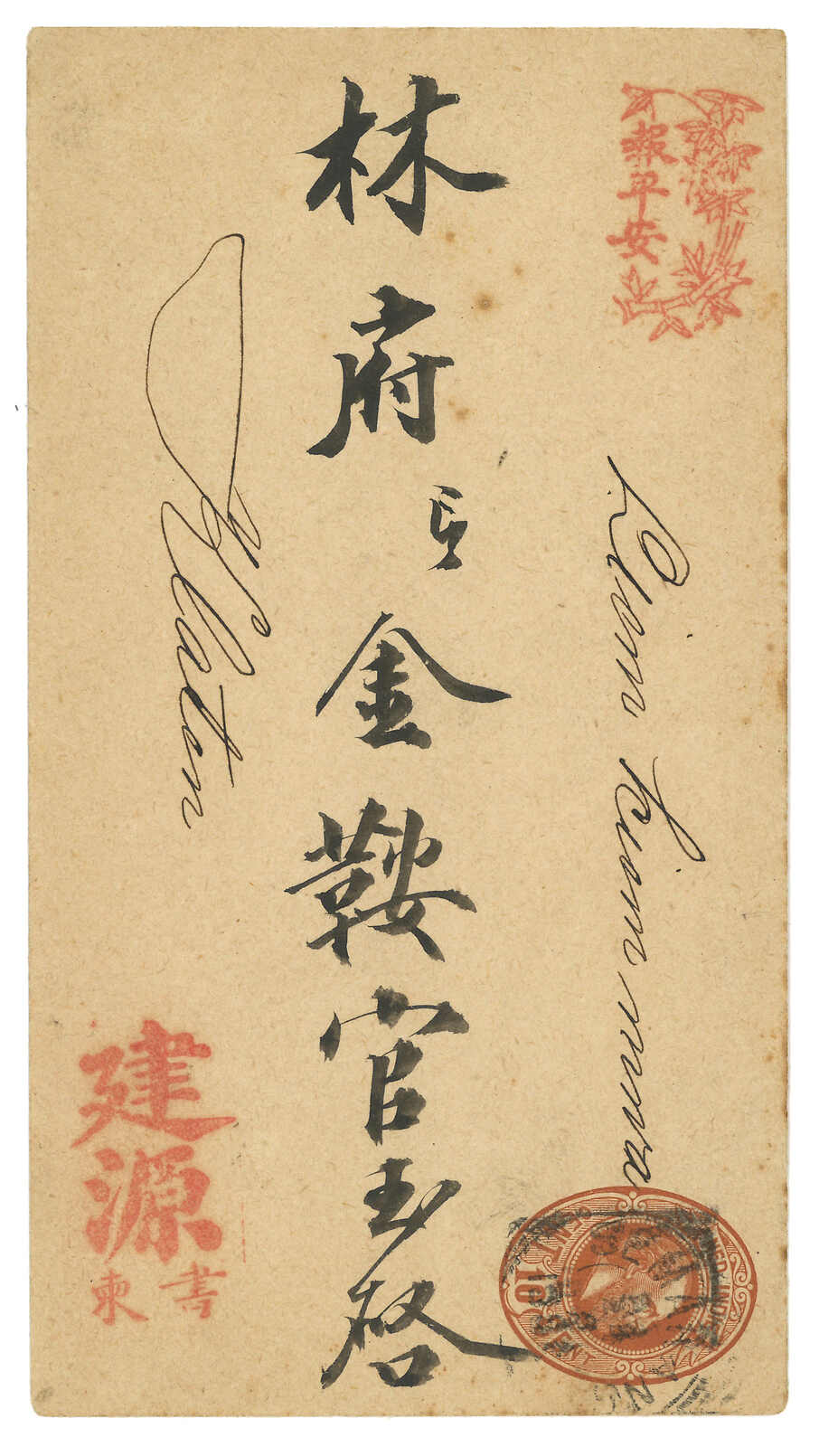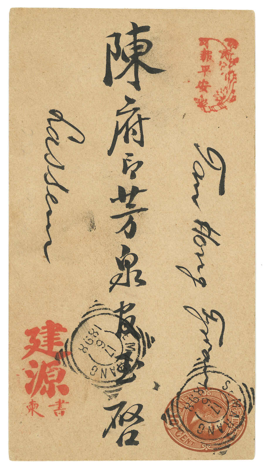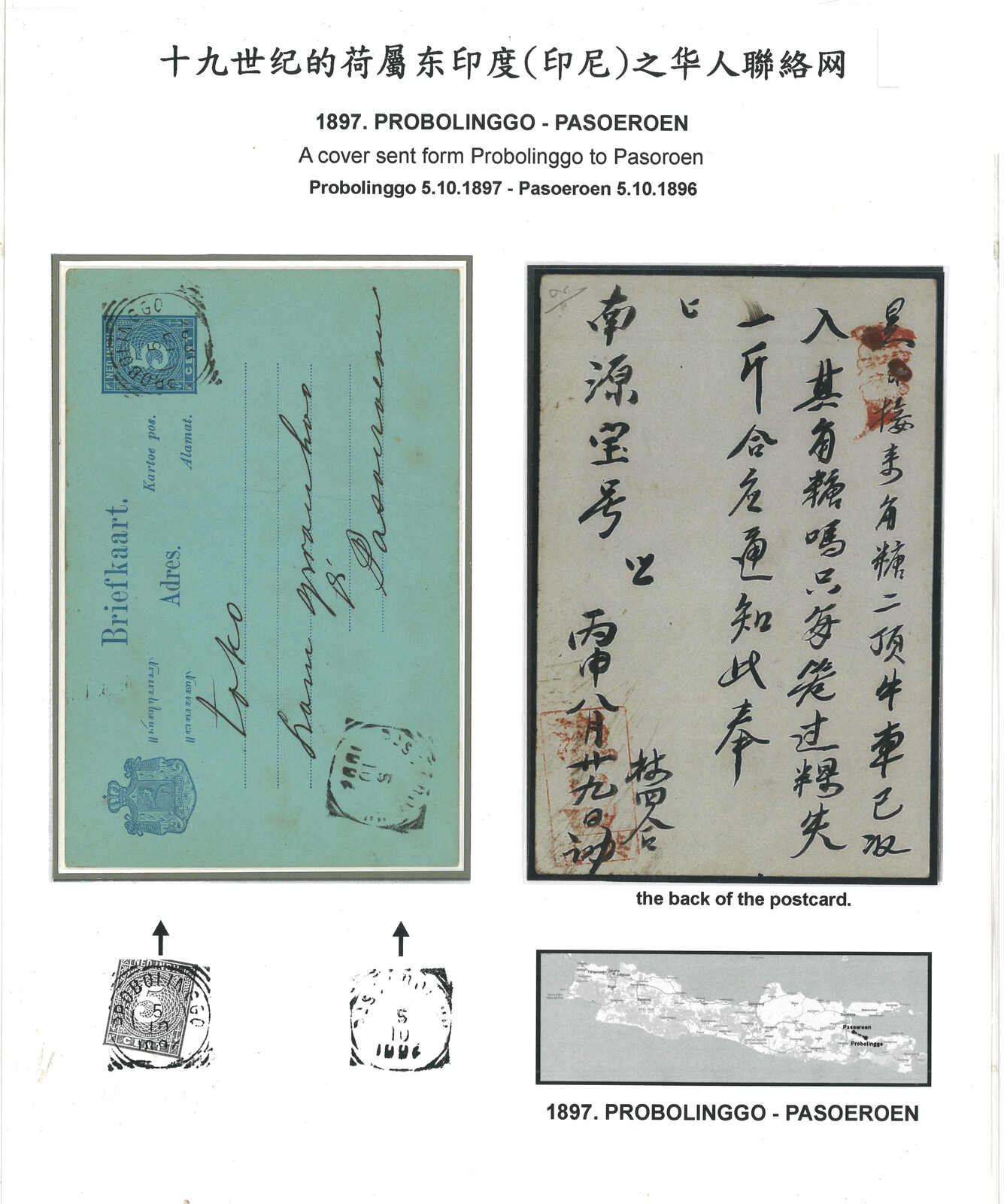 1897 (5 Oct) Dutch East Indies 5c PSC from Probolinggo to Pasoroen, tied by Probolinggo squared circle d.s. Arrived Pasoeroen (5 Oct). Reflecting the early liasion of the Chinese communities in Dutch East Indies.