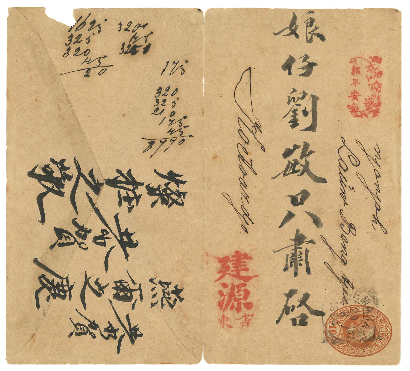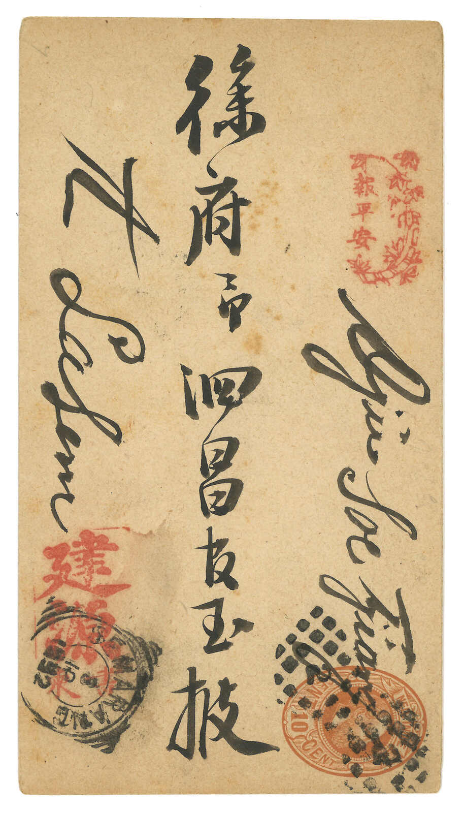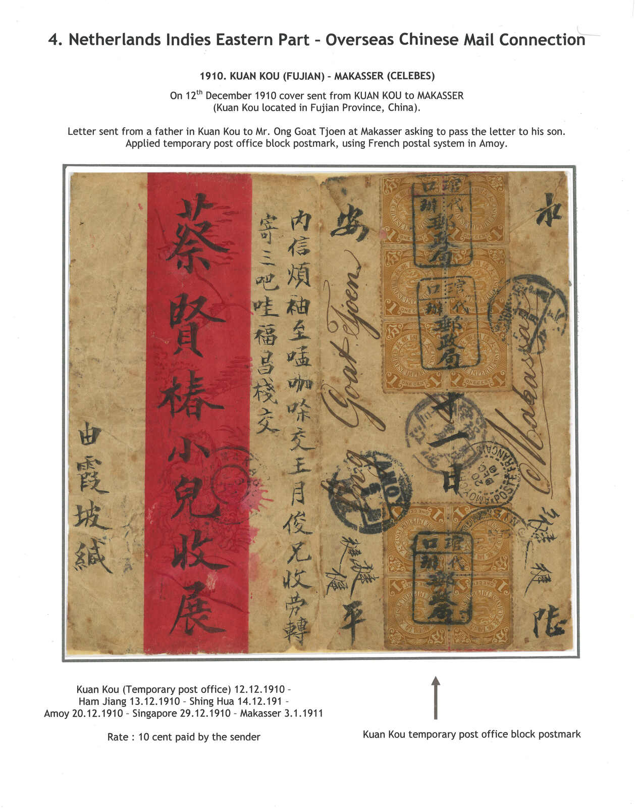 1910年琯口寄荷屬東印度望加錫。紅條封,背貼蟠龍1分共10枚,銷琯口郵政局碑形戳。12.13經涵江,12.20經廈門清郵及法國客郵局。12.29經新加坡。1.3抵望加錫。封剖開以作展示。早期經大清郵政寄荷屬東印度之難得例子。(Image 1)