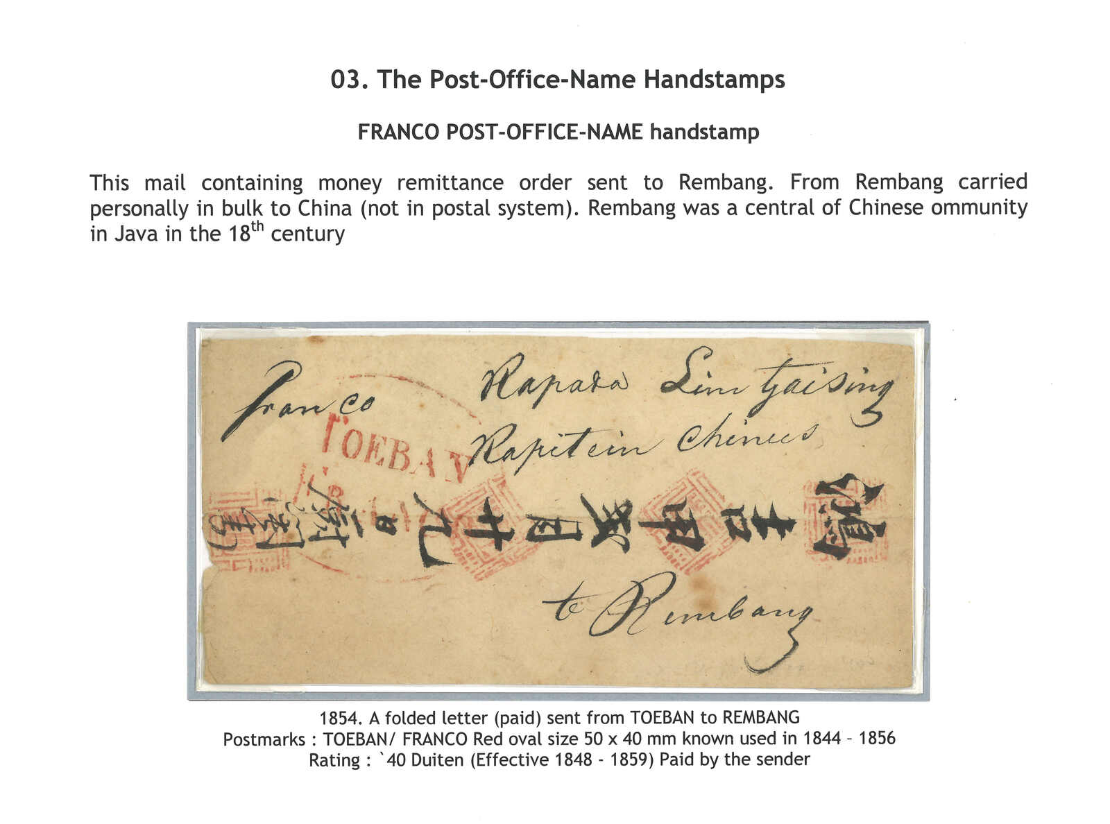 1850s a group of 3 Dutch East Indies Qiaopi bulk mail covers, from Reside Madion or Toeban to Rembang, with oval “FRANCO” postmarks. Chinese immigrants living in the small towns had to remit the money to Rembang first where the