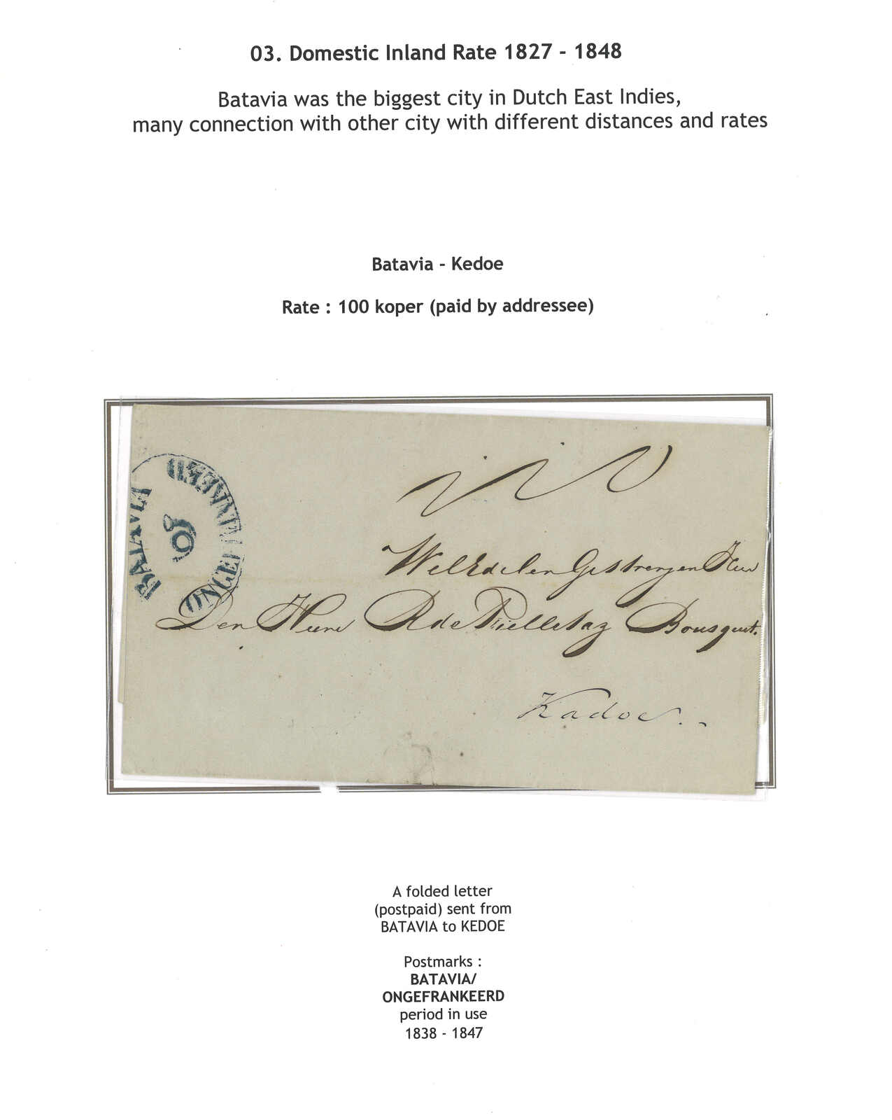 ca 1830s Batavia to Kedoe. Entire letter, rated "100" (koper), applied with oval "BATAVIA / ONGEFRANKEERD" posthorn seal.