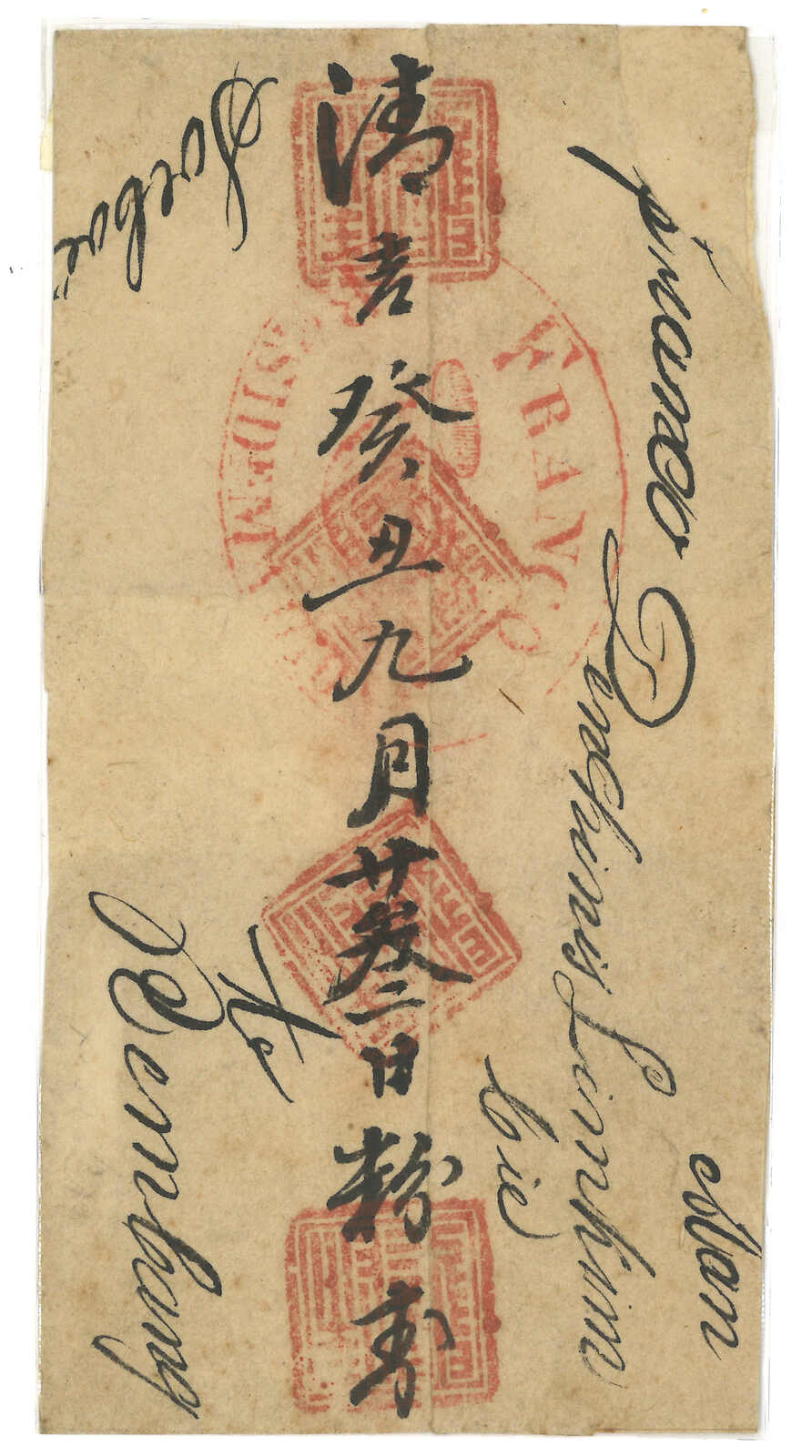 1850年代一組三件荷屬東印度僑批總包,分別自從粉或Toeban寄南旺,鈐“FRANCO”橢圓形戳記。 當時小地方的華僑先將批款寄往南旺,南旺的批局再寄回中國。一組十分難得的早期荷屬東印度僑批。(Image 1)