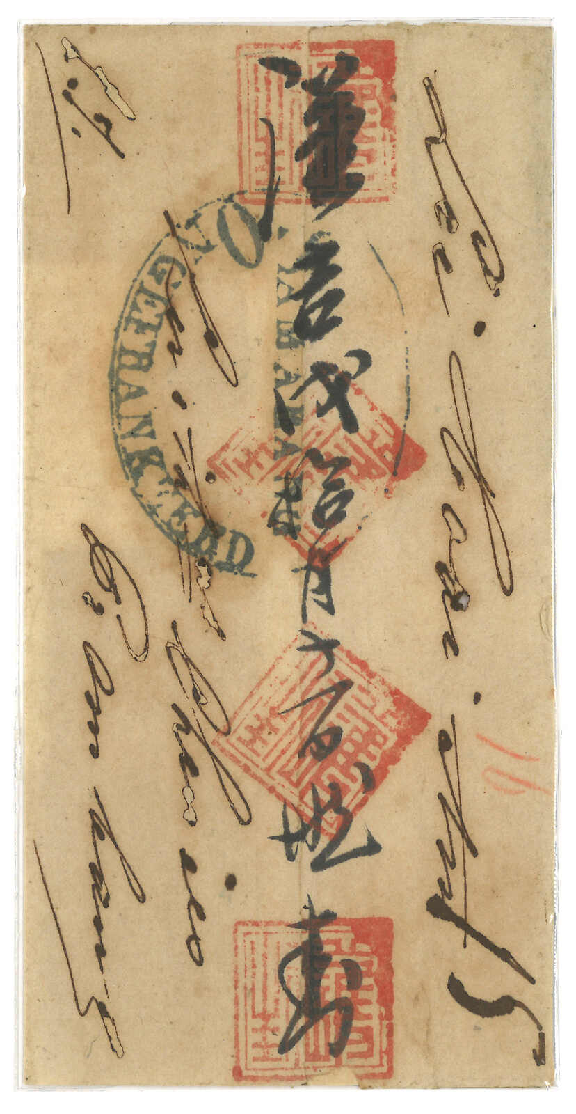 1850年代一組三件荷屬東印度僑批總包,分別自車里汶或結力石寄南旺,鈐“ONGEFRANKEERD” 橢圓形戳記,並寫有郵資。當時小地方的華僑先將批款寄往南旺,南旺的批局再寄回中國。一組十