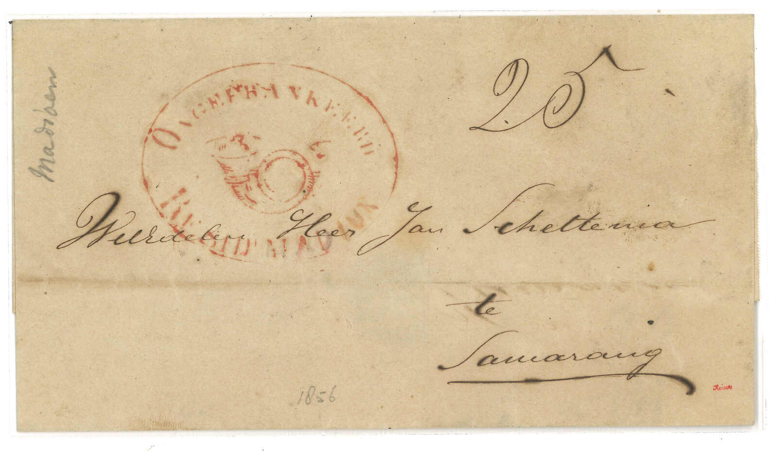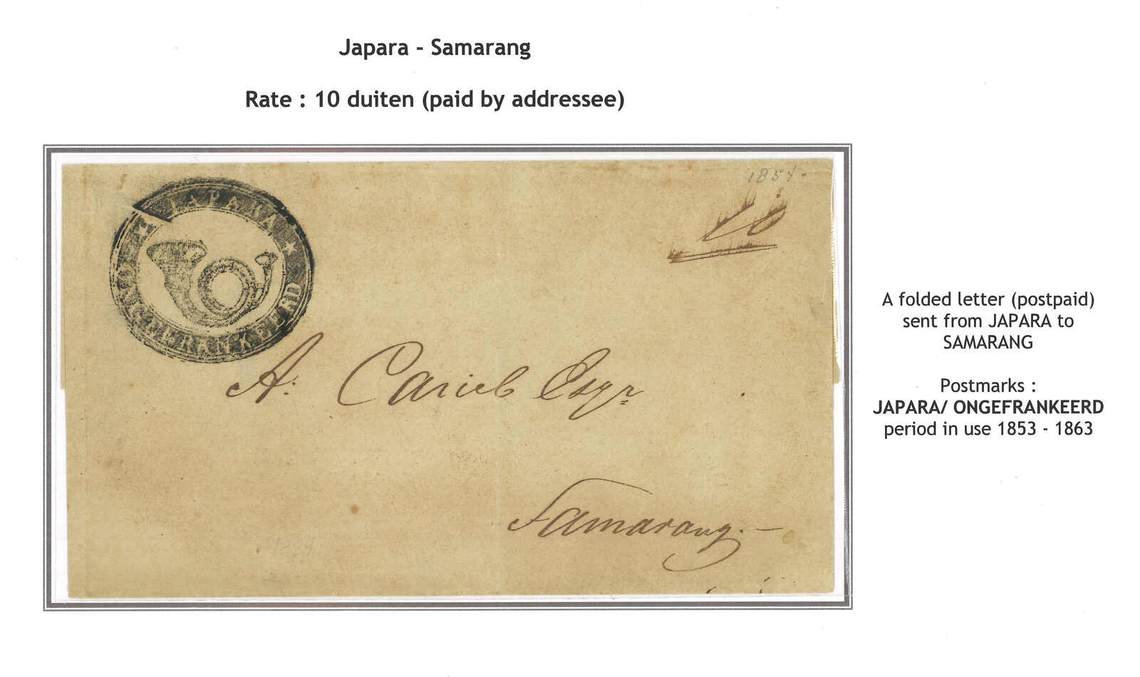 約1850年代一對分別由Japara及從粉寄三寶壟之郵簡,鈐“ONGEFRANKEERD”橢圓號角郵戳。(Image 1)
