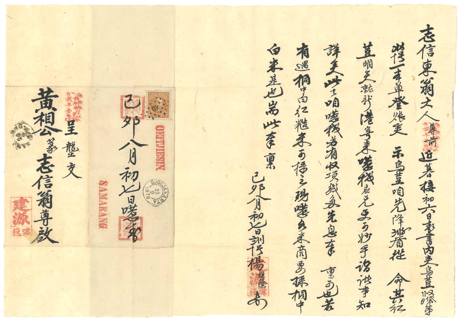 1879 (23 Sep) Entire letter from the branch merchant of a Qiaopiju in Djocjakarta to his boss in Semarang, f.w. Dutch East Indies 10c, tied by "10" diamond obliterator, alongside with Djocjakarta cds. On reverse with the