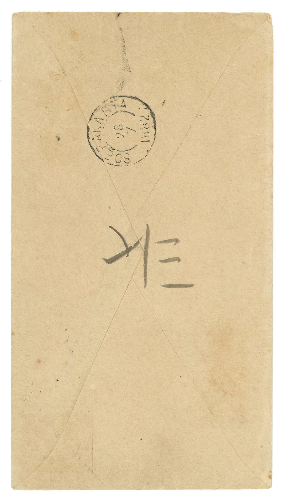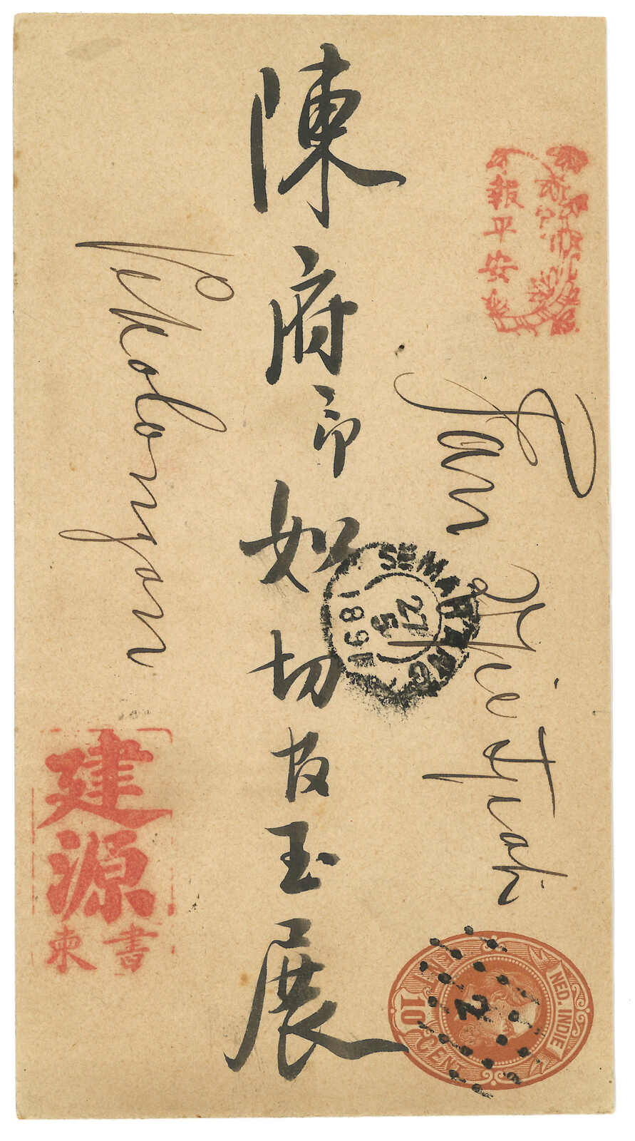 1882 (27 Jul) Dutch East Indies 10c stationery cover from Semarang to Soepakarta, tied by "2" diamond obliterator, alongside with Semarang cds and Qiaopiju correspondence vertical seal. Arrived Soepakarta (28 Jul).