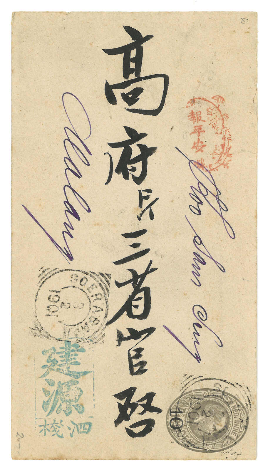 1901 (3 Feb) Dutch East Indies 10c stationery cover from Soerabaja to Malang, tied by Soerabaja squared circle d.s, alongside with Qiaopiju correspondence vertical seal. Arrived Malang (3 Feb). Scarce early Qiaopiju