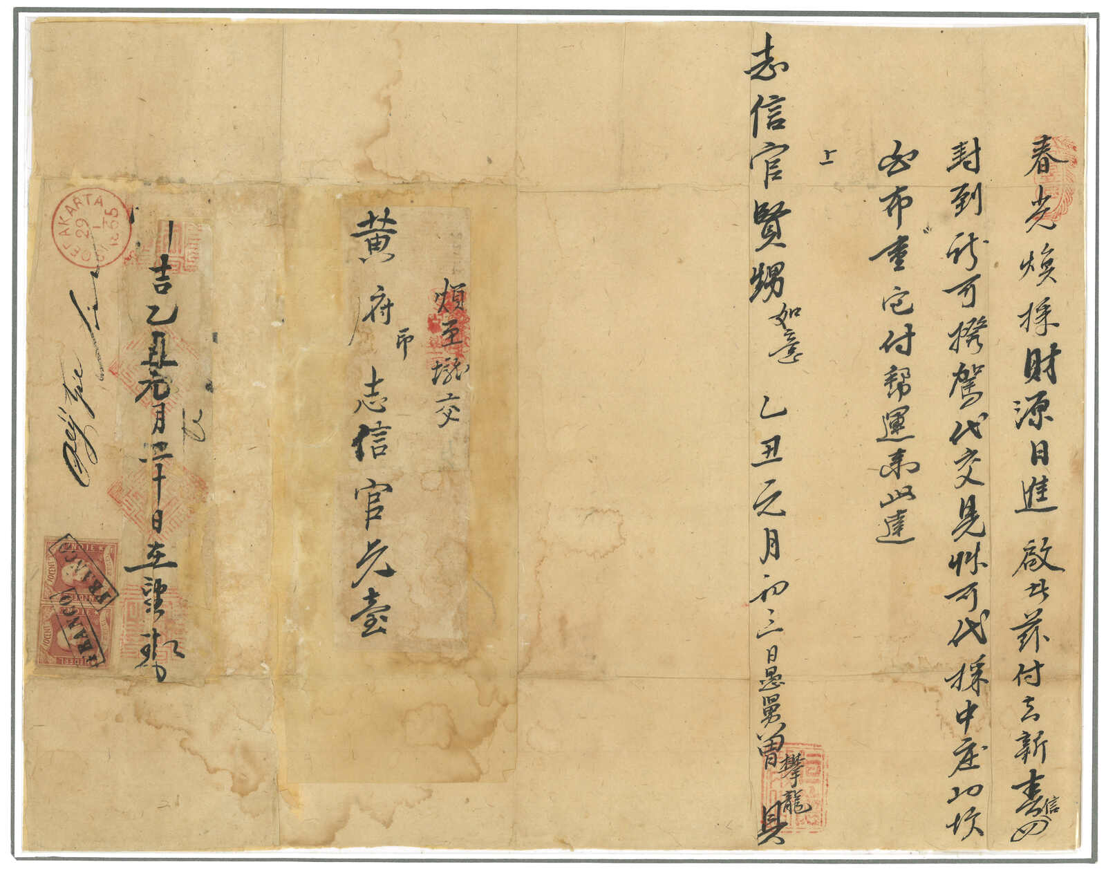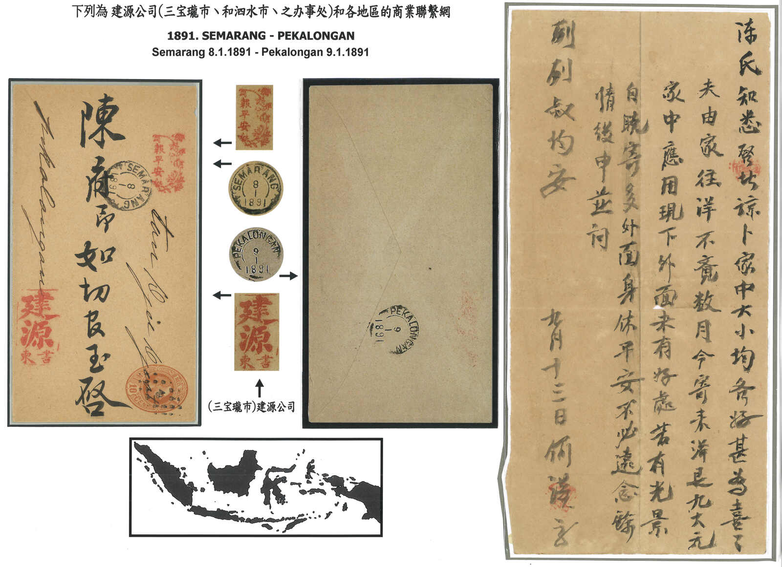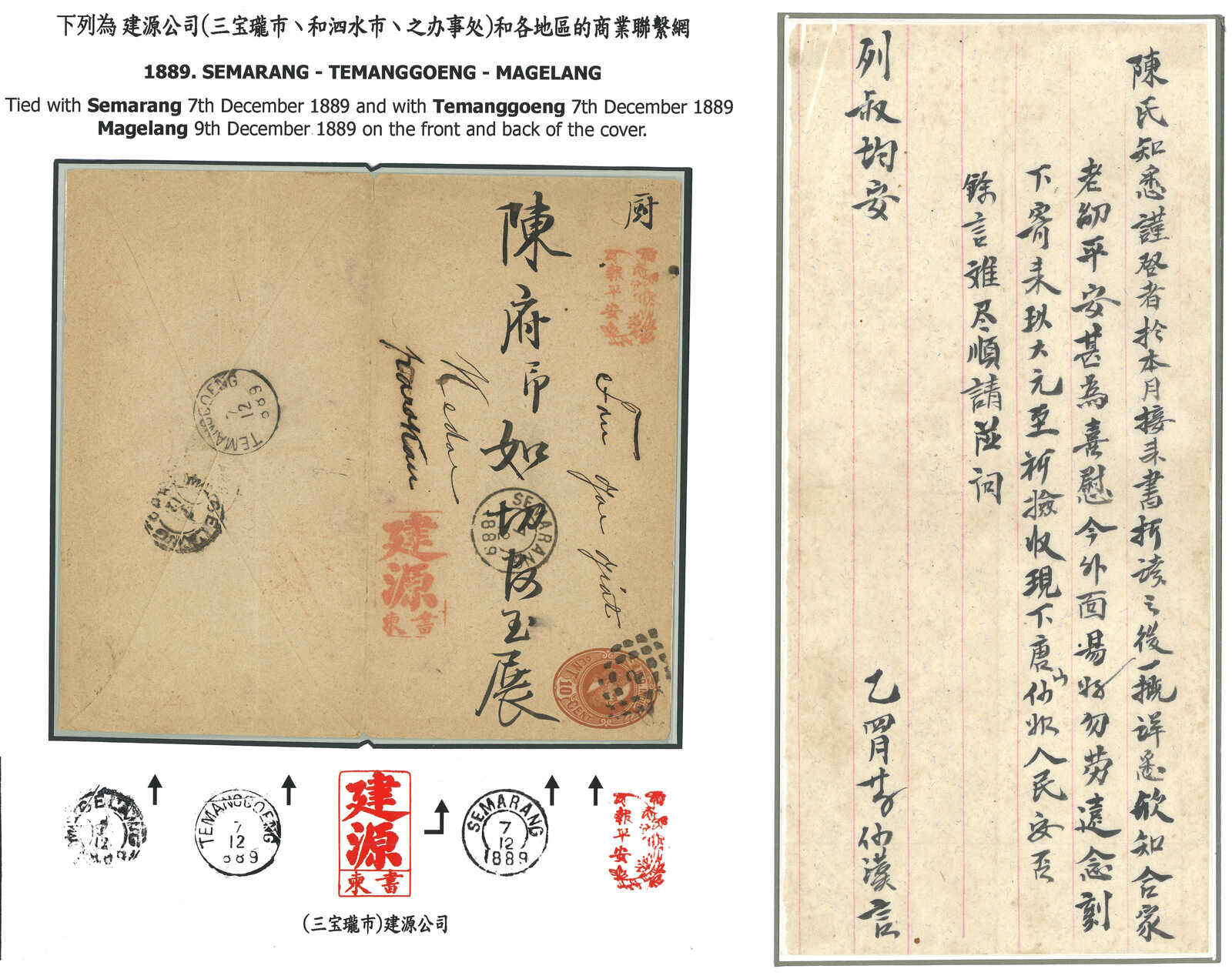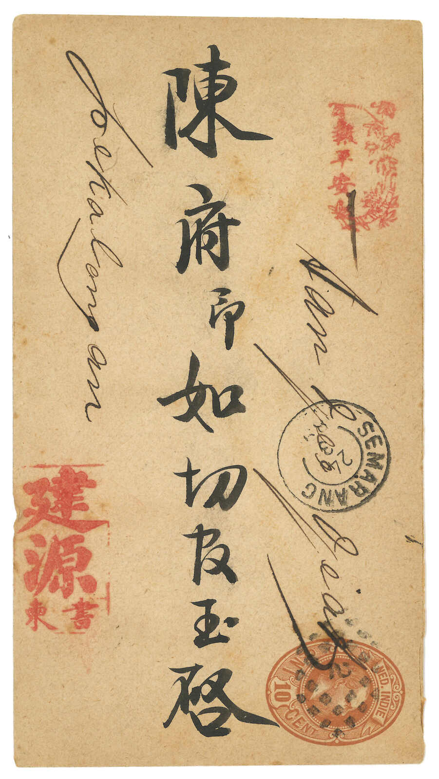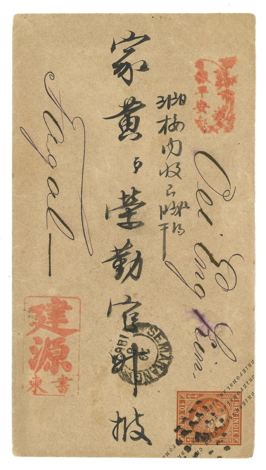 1900.9.25 荷屬東印度2-1/2分郵資封,自三寶壟寄Ambarawa,銷三寶壟內圓外方圓日戳,旁鈐建源公司直戳。抵Ambarawa。少見之早期荷屬東印度華僑商務書信。封左側打開。(Image 1)