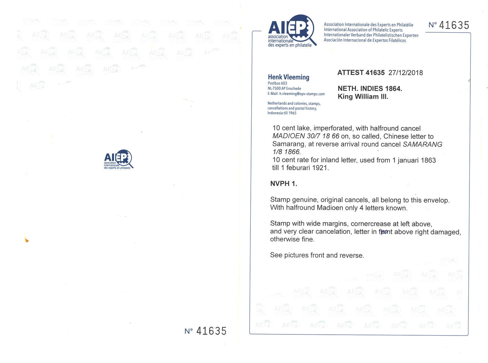 1866 (18 Jul) Entire letter from the branch merchant of a Qiaopiju in Soerakarta to his uncle (as well as boss) in Semarang, f.w. Dutch East Indies 10c, tied by "MADIOEN / FRANCO" d.s.. Arrived Samararng (1 Aug). The content