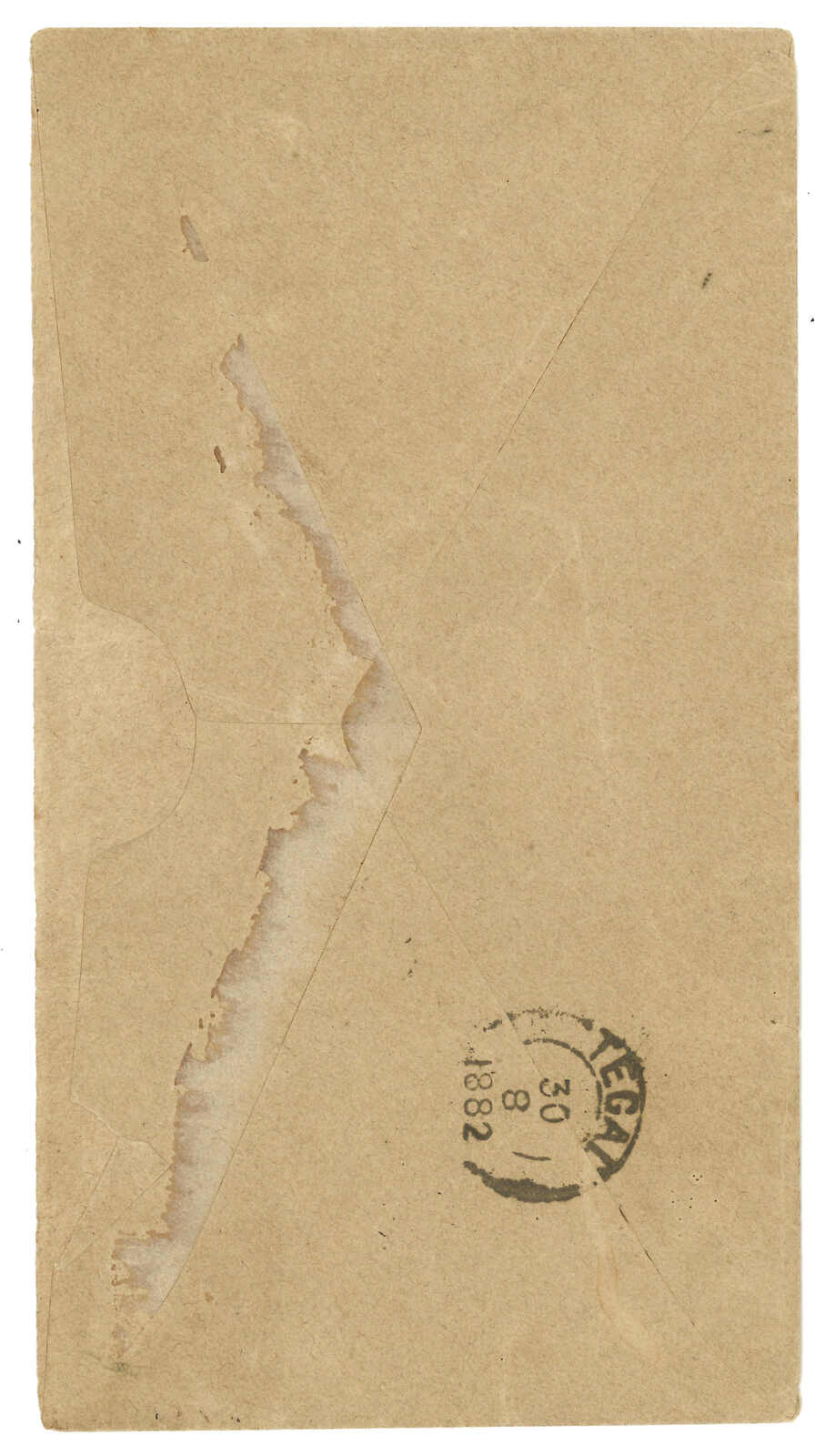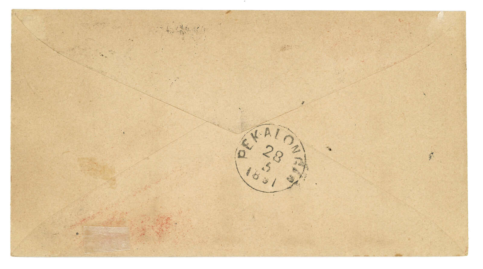 1882.7.27 荷屬東印度10分郵資封,自三寶壟寄Soepakarta,銷“2”鑽石點戳,旁鈐三寶壟日戳及建源公司直戳。7.28抵Soepakarta。(Image 1)