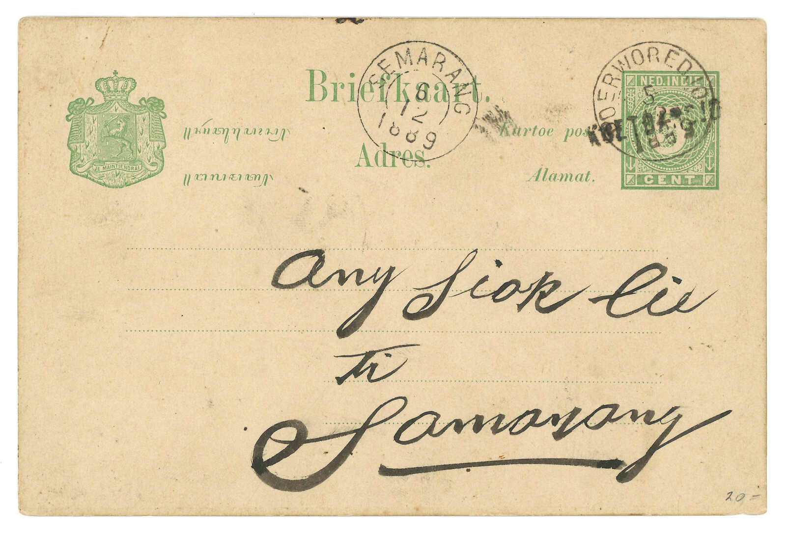 1897.10.5 荷屬東印度5分郵資片自龐越寄岩望,銷龐越內圓外方日戳。10.5抵岩望。反映了早期在荷屬東印度之華人書信往來。(Image 1)