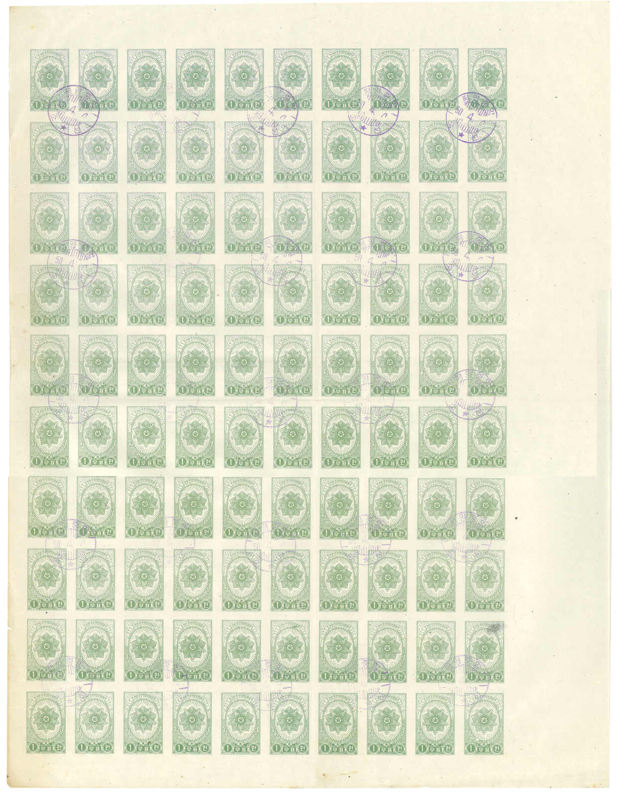 1950.4.4 國旗動章綠色1圜蓋銷版票100枚,銷平壤首日日戳。無貼。對折兩次。(Image 1)