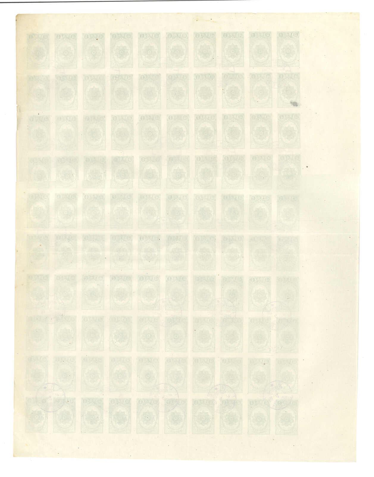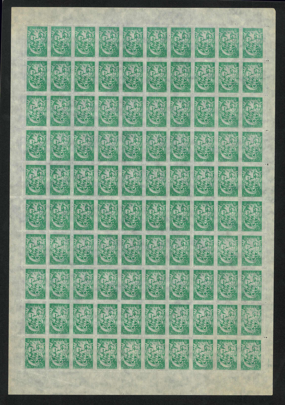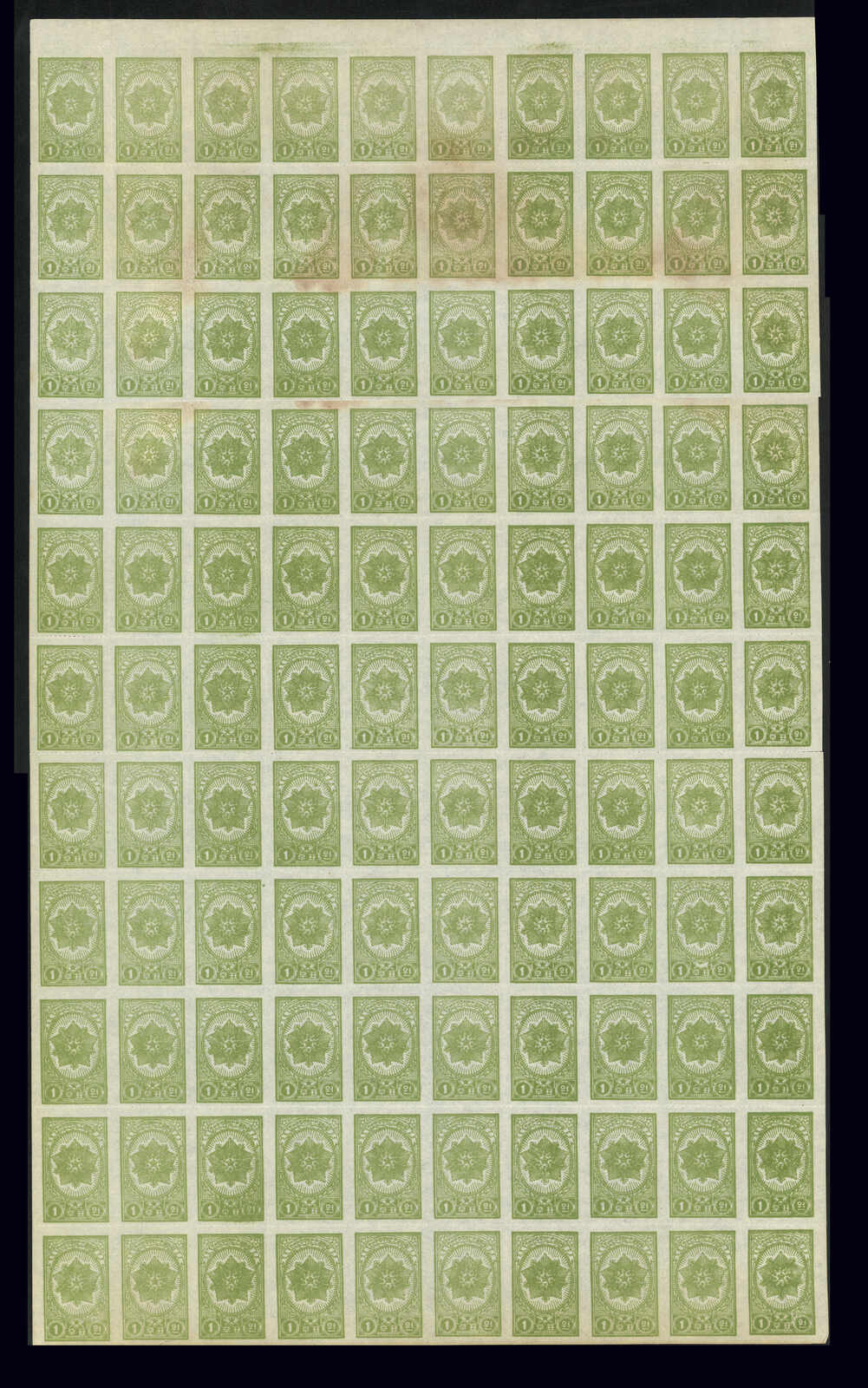 1950-1957 Order of the National Flag green rouletted 1w in complete sheet of 100. MNH. A few stamps with light stains. Folded along perf.