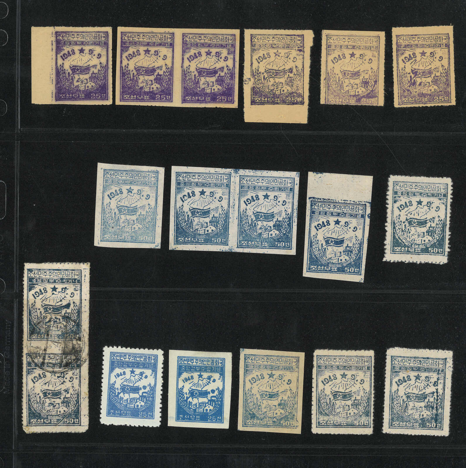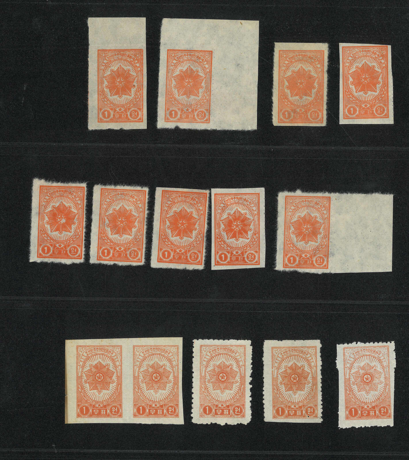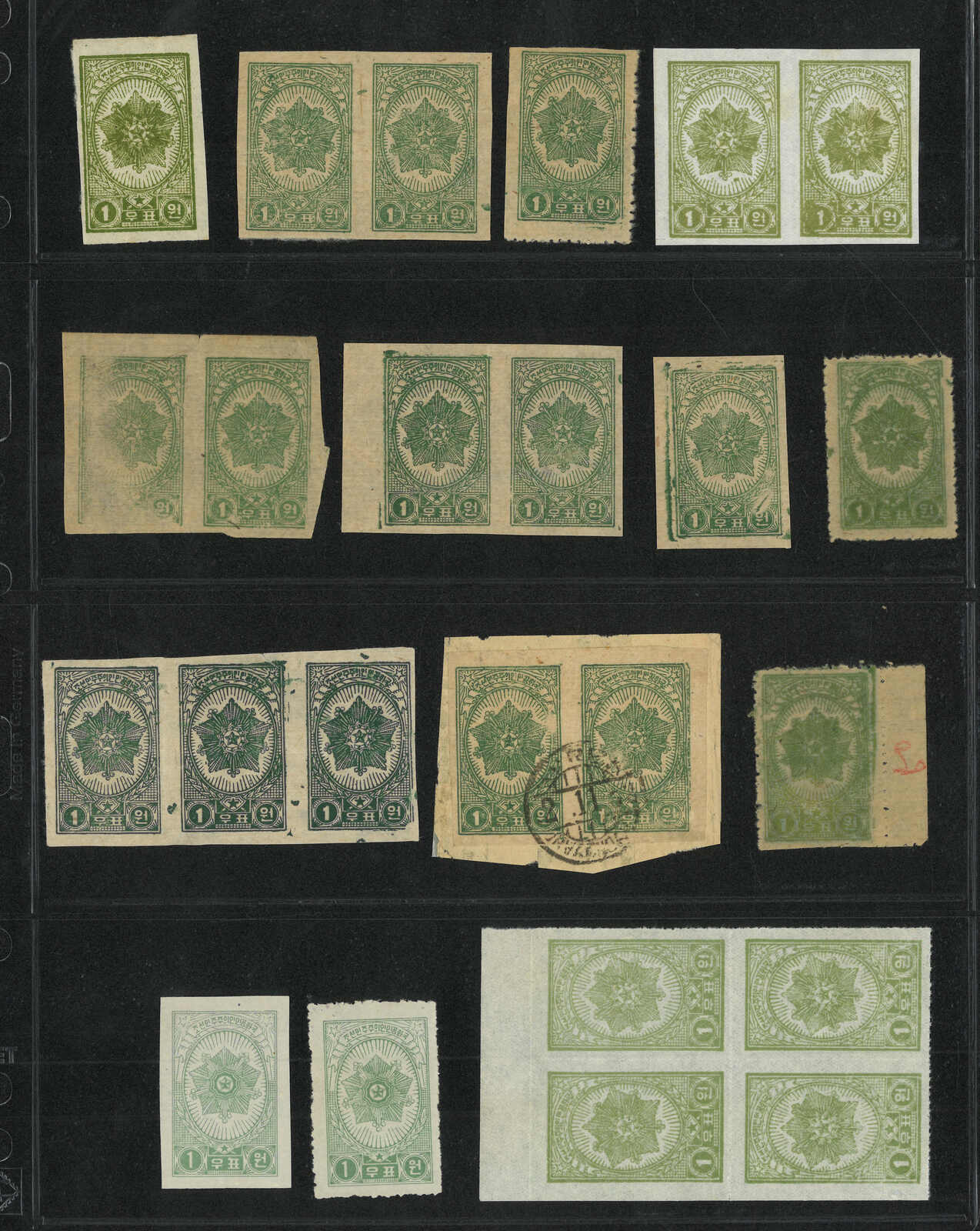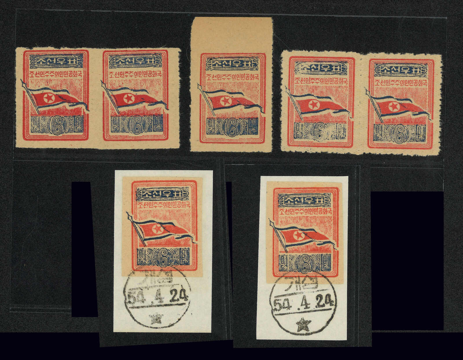 1949年北韓國旗棕紙6圜共7枚,包含新票單枚、雙連及兩枚蓋銷剪片。(Image 1)