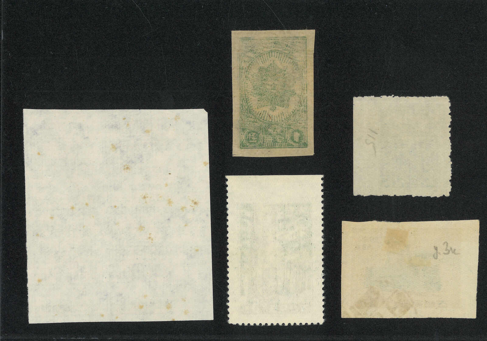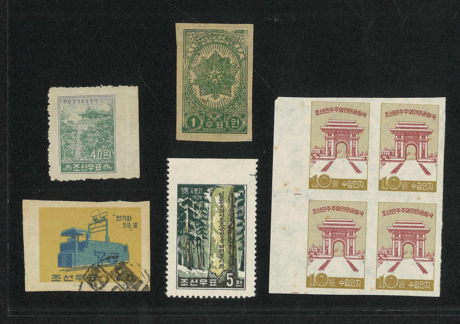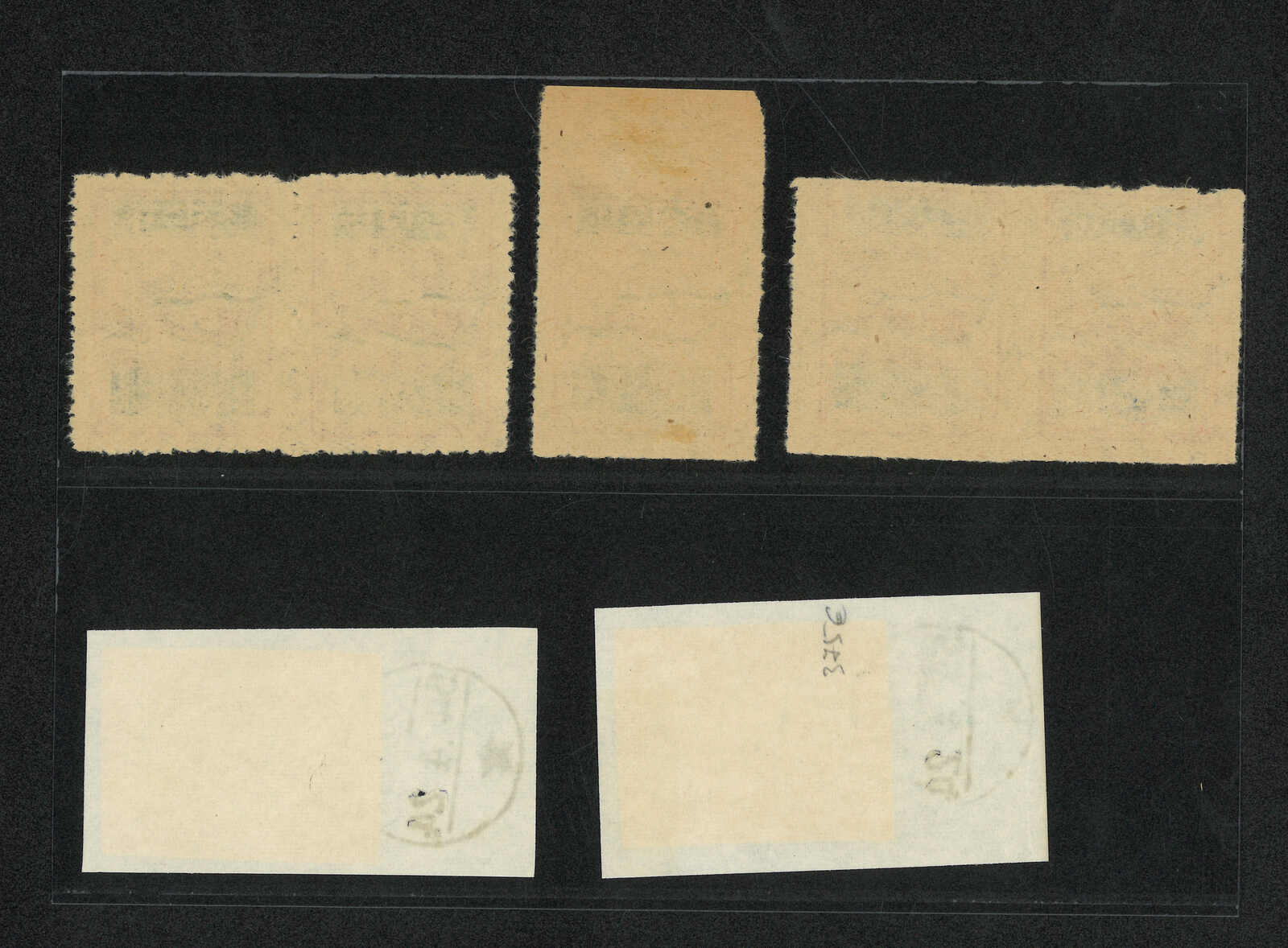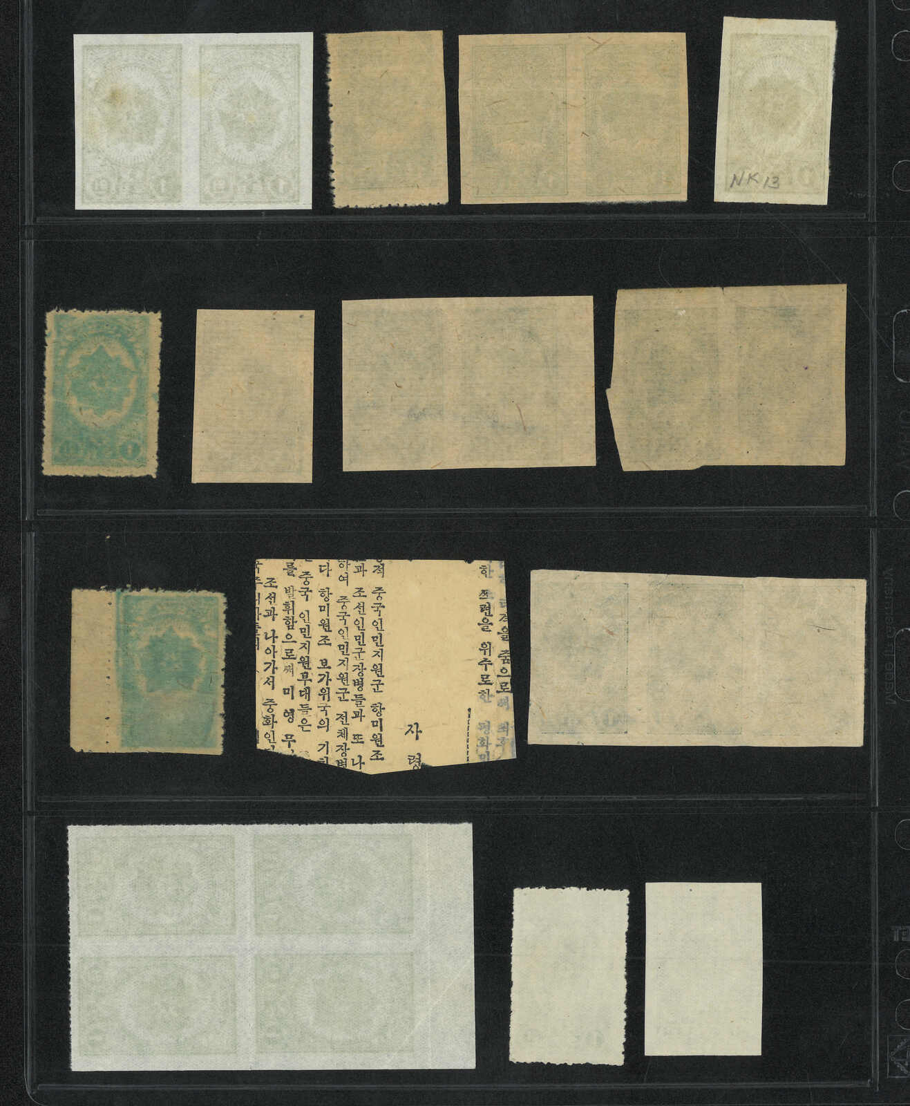 1949年北韓國旗棕紙6圜共7枚,包含新票單枚、雙連及兩枚蓋銷剪片。(Image 1)