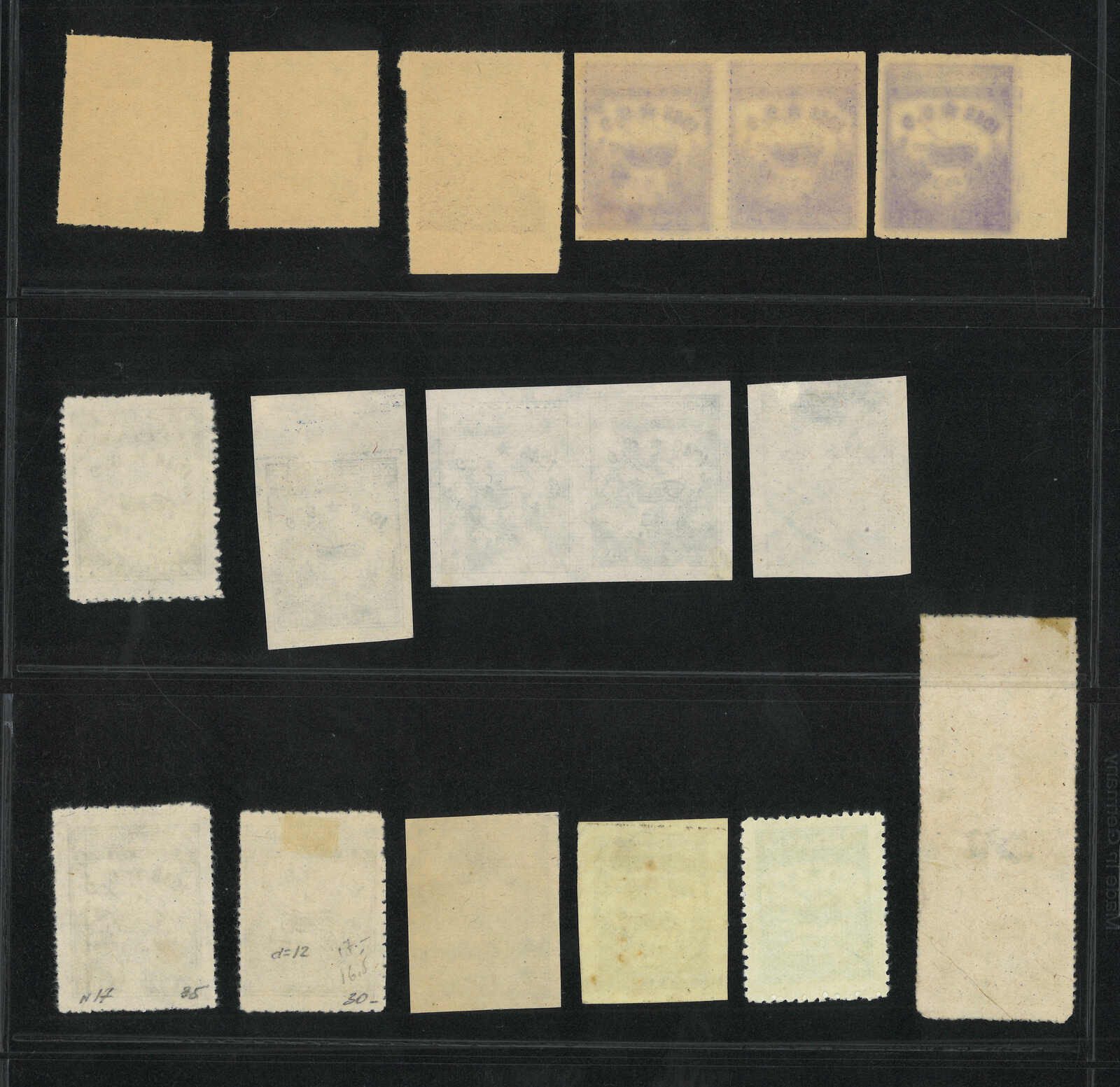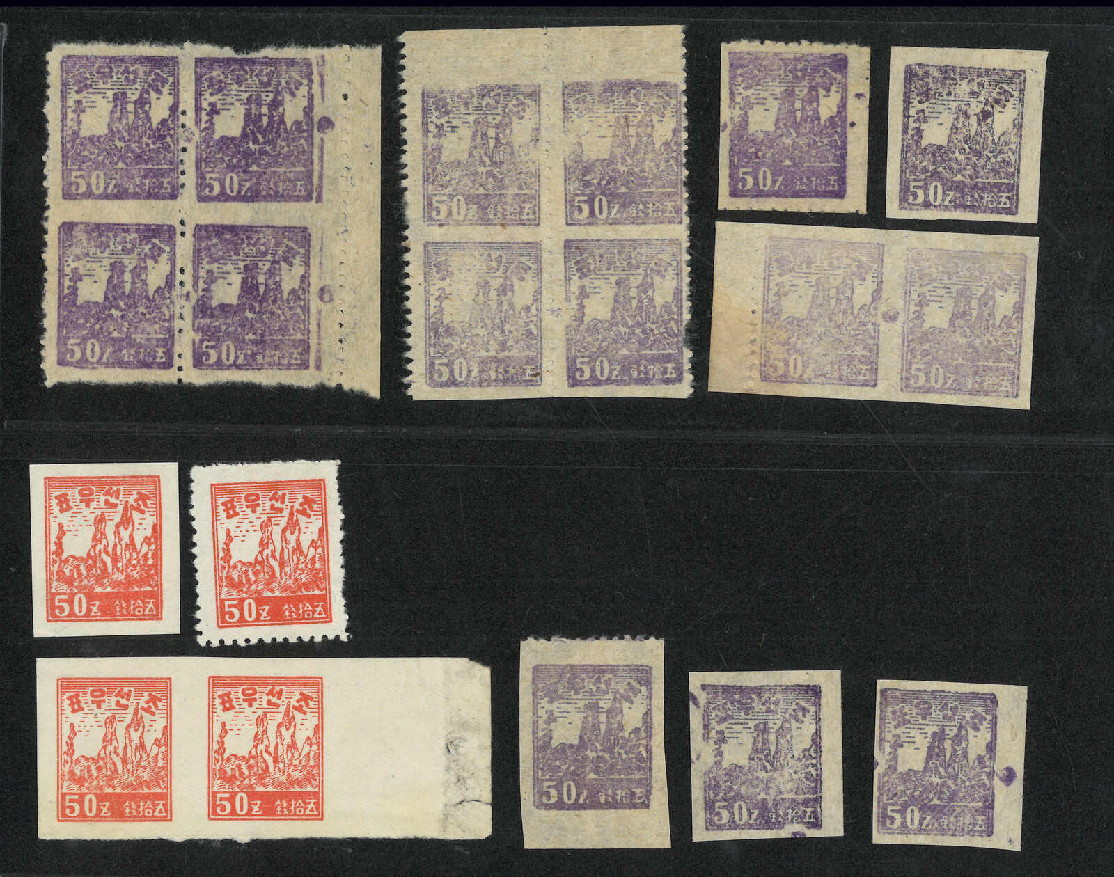 1946年金剛山紫色及紅色50圜新票一組19枚,包含有齒、無齒單枚及連票。(Image 1)
