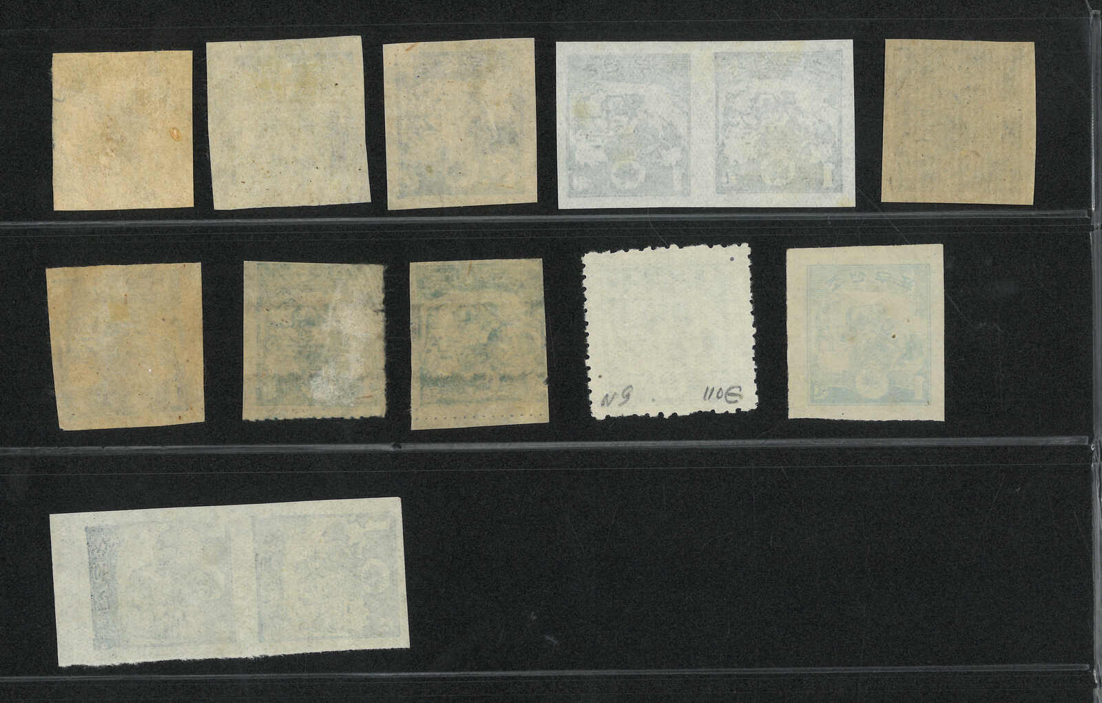 A group of 8 North Korean variety stamps, showcasing imperf and double-print varieties.