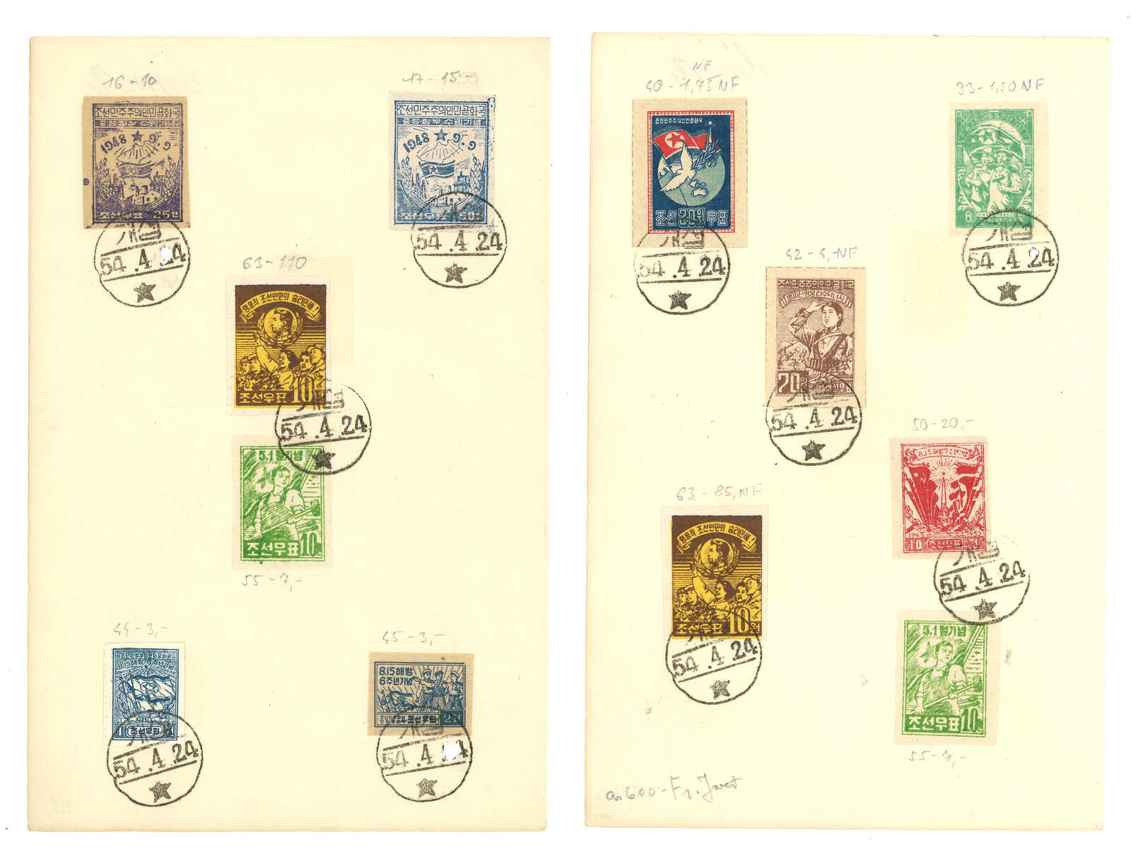 A group of 4 sheets f.w. North Korean CTO issues, including 5th Anniv of Liberation, 6th Anniv of Liberation, General Tang Ho-san, Order of Soldier's Honour, Peace Propaganda etc.