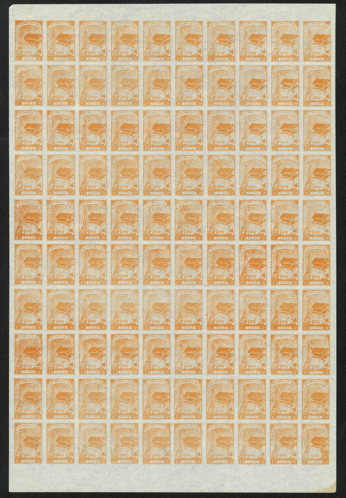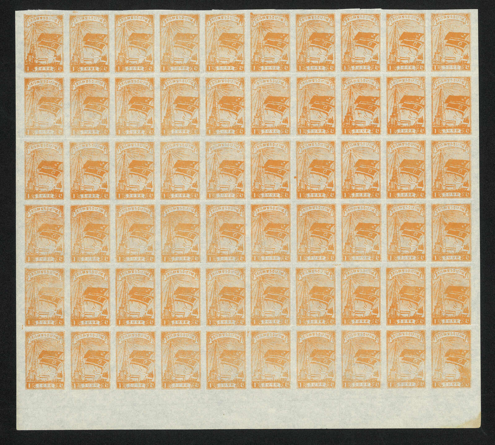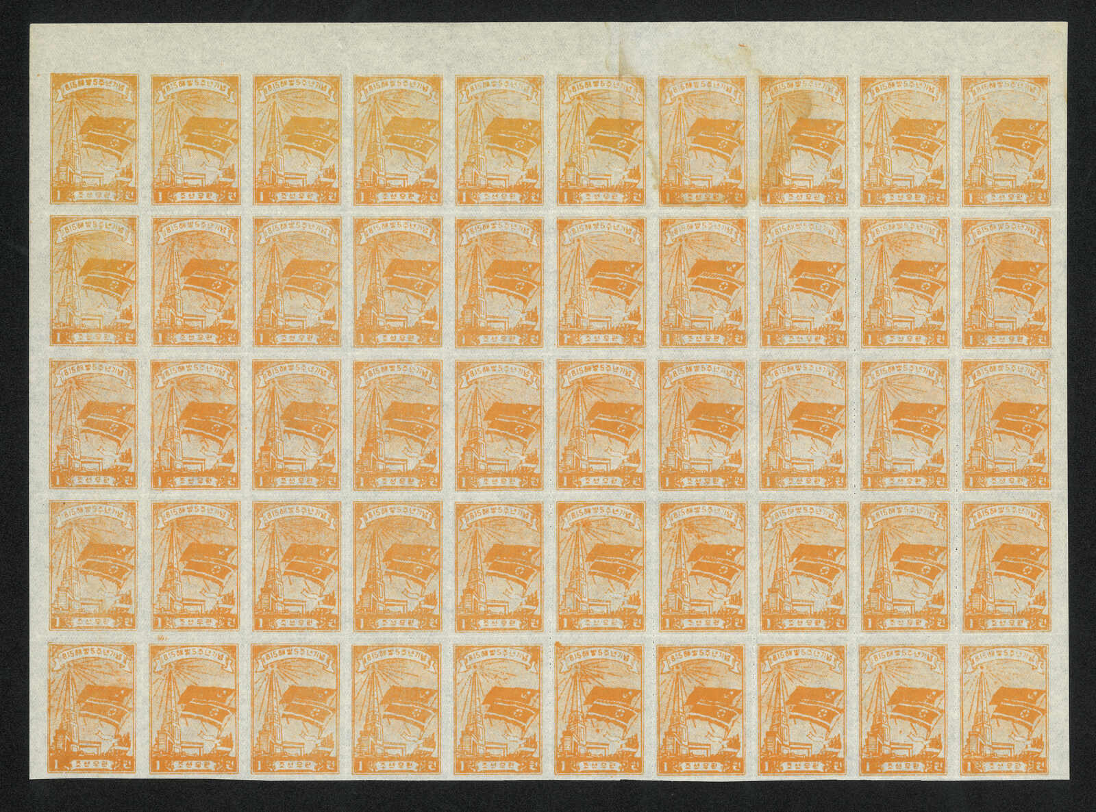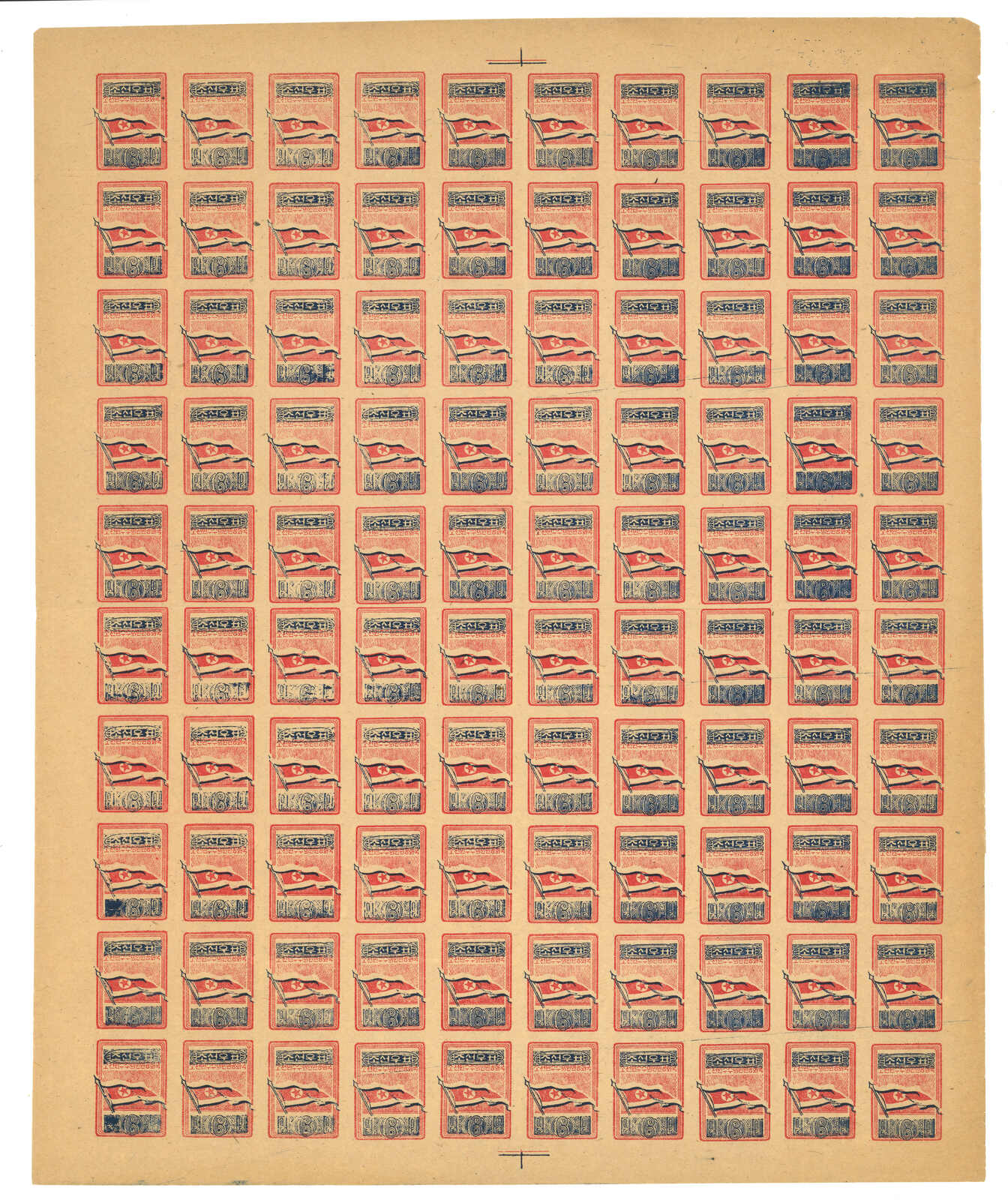 1949 North Korean Flag - Brownish Paper 6w in complete sheet of 100, MNH. Folded along perf.