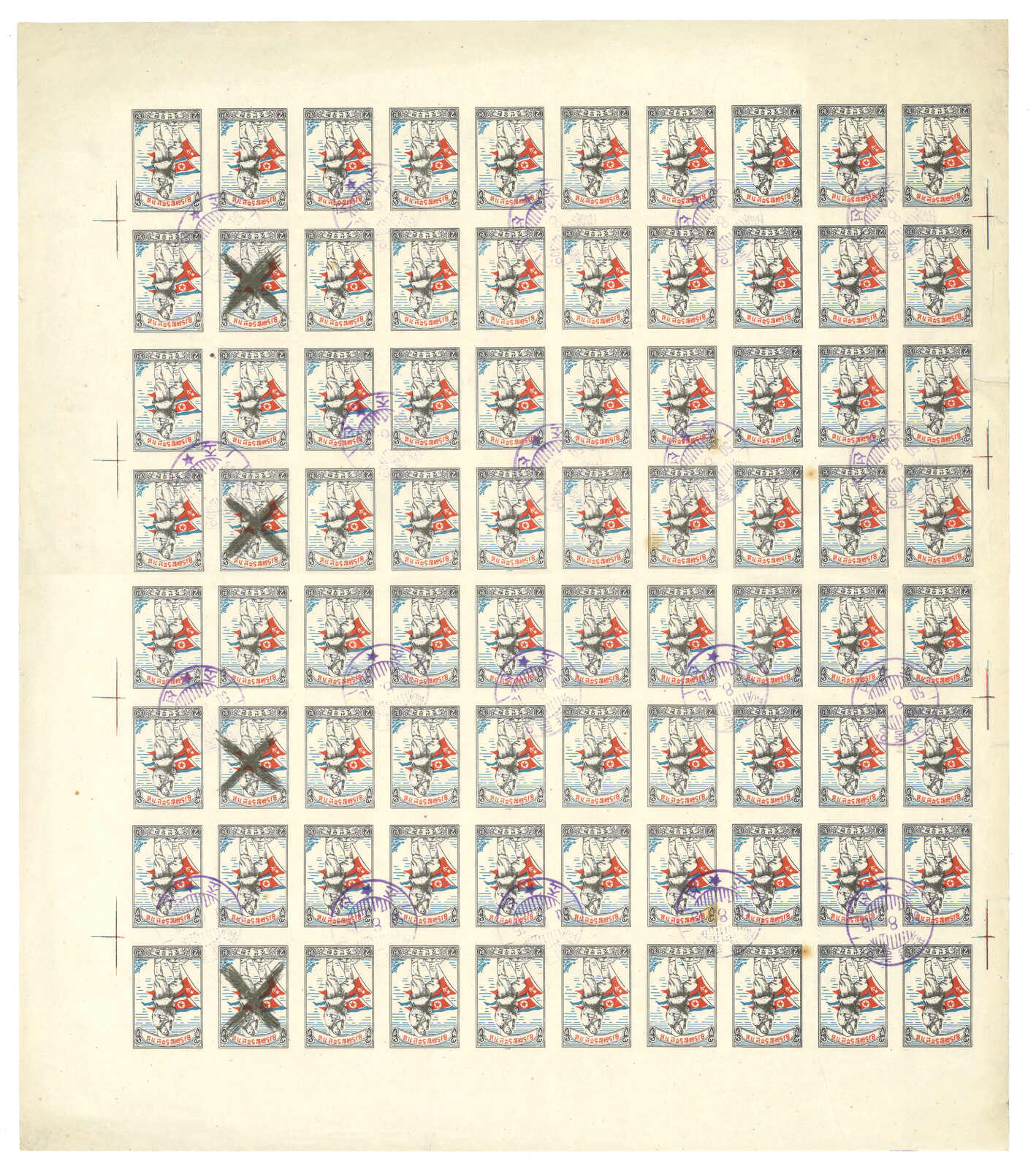1949年北韓國旗棕紙6圜版票100枚新,無貼折版。(Image