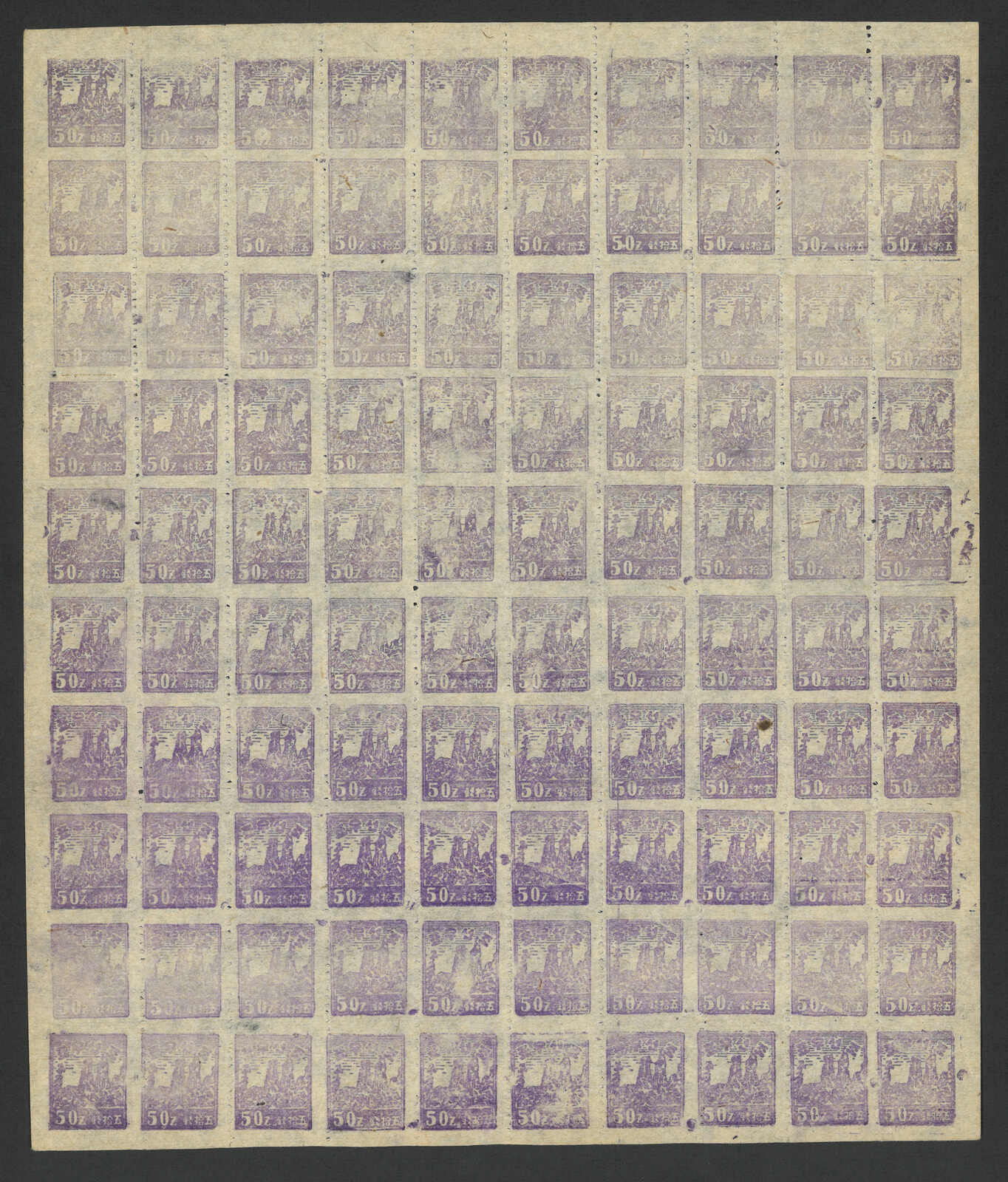 1946 Diamond Mountains 50Ch blue in complete sheet of 100, vertically imperf, MNH.