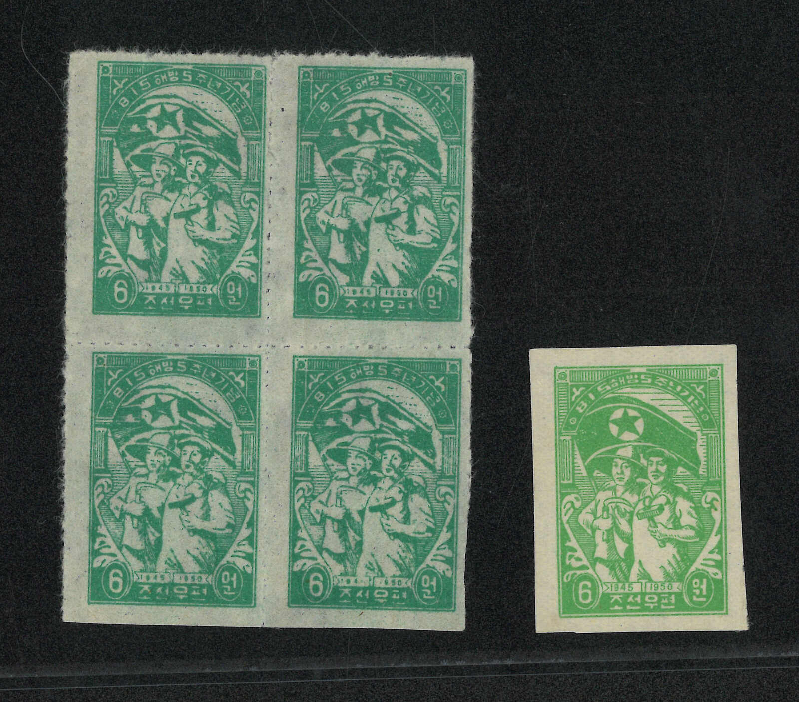1950-1957 The 5th Anniversary of Liberation from Japan 6w deep green perf block of 4 and light green imperf single. Both MNH.