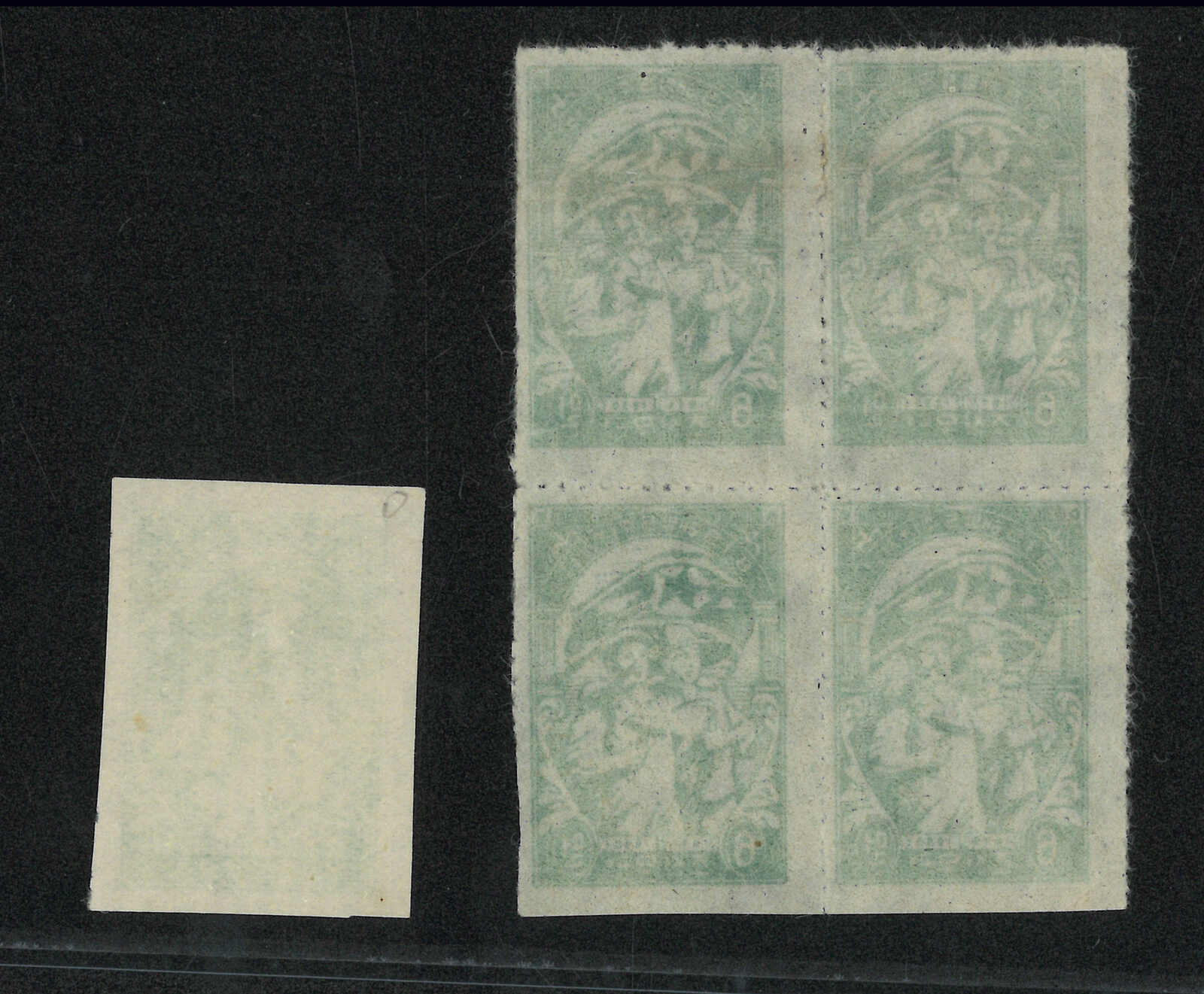 1950至1957年自日本佔領解放七週年6圜深綠色有齒四方連及淺綠色單枚新,均無貼。(Image 1)