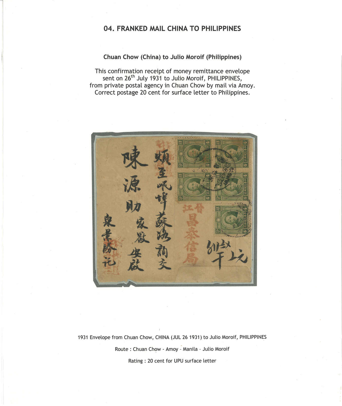 3988 cover image1931 (26 Jul) Huipi (receipt of money remittance) from Tsinkiang to Julio Moroif, Philippines, applied with Tsinkiang Qiaopiju vertical seal. F.w. SYS 4c x5 for 20c international letter rate, tied by Szeming bilingual cds.