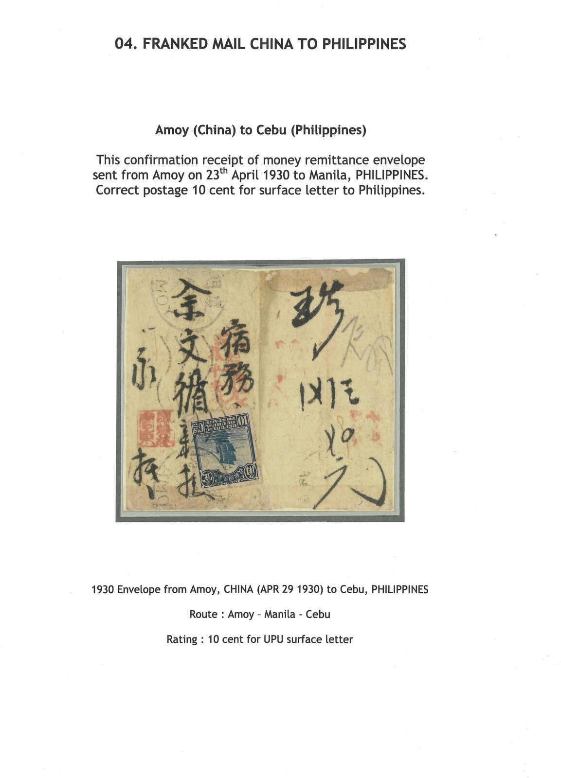 3981 cover image1929 Huipi (receipt of remittance) red band cover from Tzetsao to Cebu, Philippines, f.w. Junk 10c, tied by Tzetsao bilingual cds. Transit Chuanchow. Scarce Huipi example from Tzetsao to Philippines.