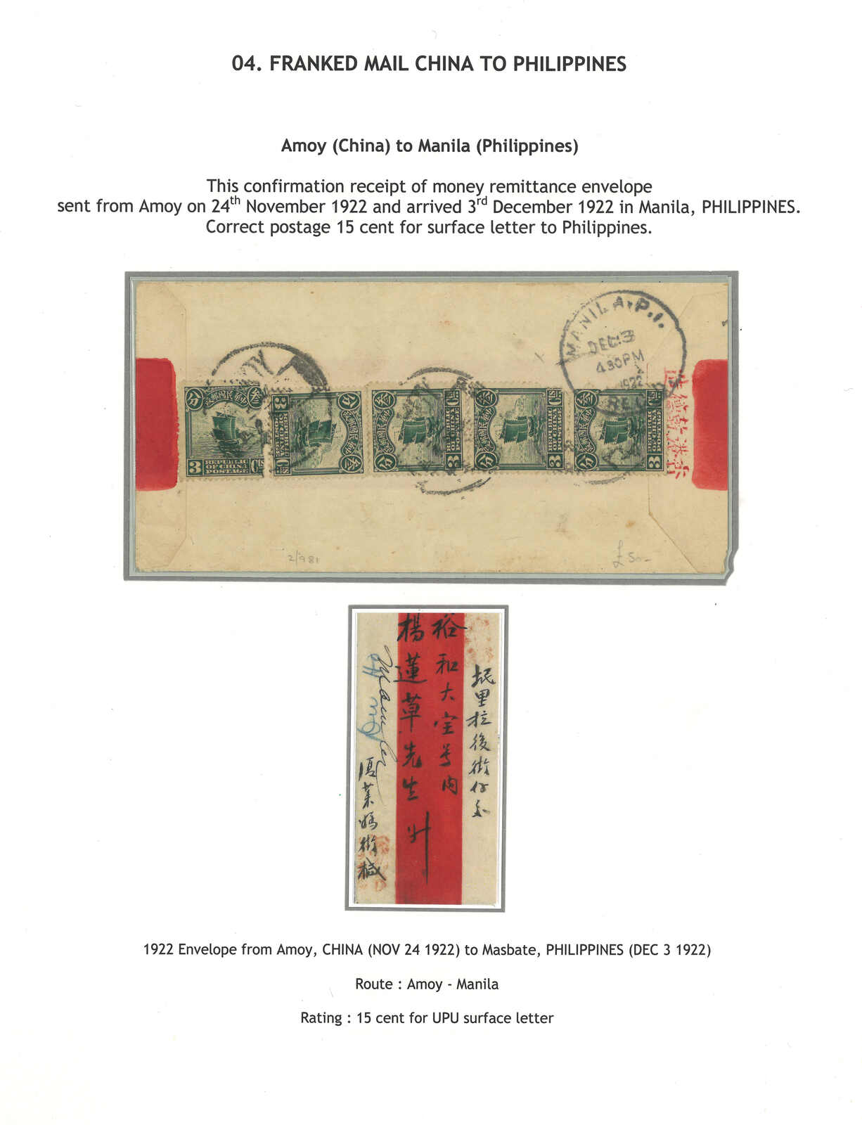 3978 cover image1922 (24 Nov) Huipi (receipt of remittance) red band cover from Amoy to Manila, f.w. Junk 3c x5 on reveres for international letter rate, tied by Amoy bilingual cds. Arrived Manila (3 Dec). International letter rate was raised from 10c to 15c between 1 Nov and 31 Dec 1922, thus very scarce.