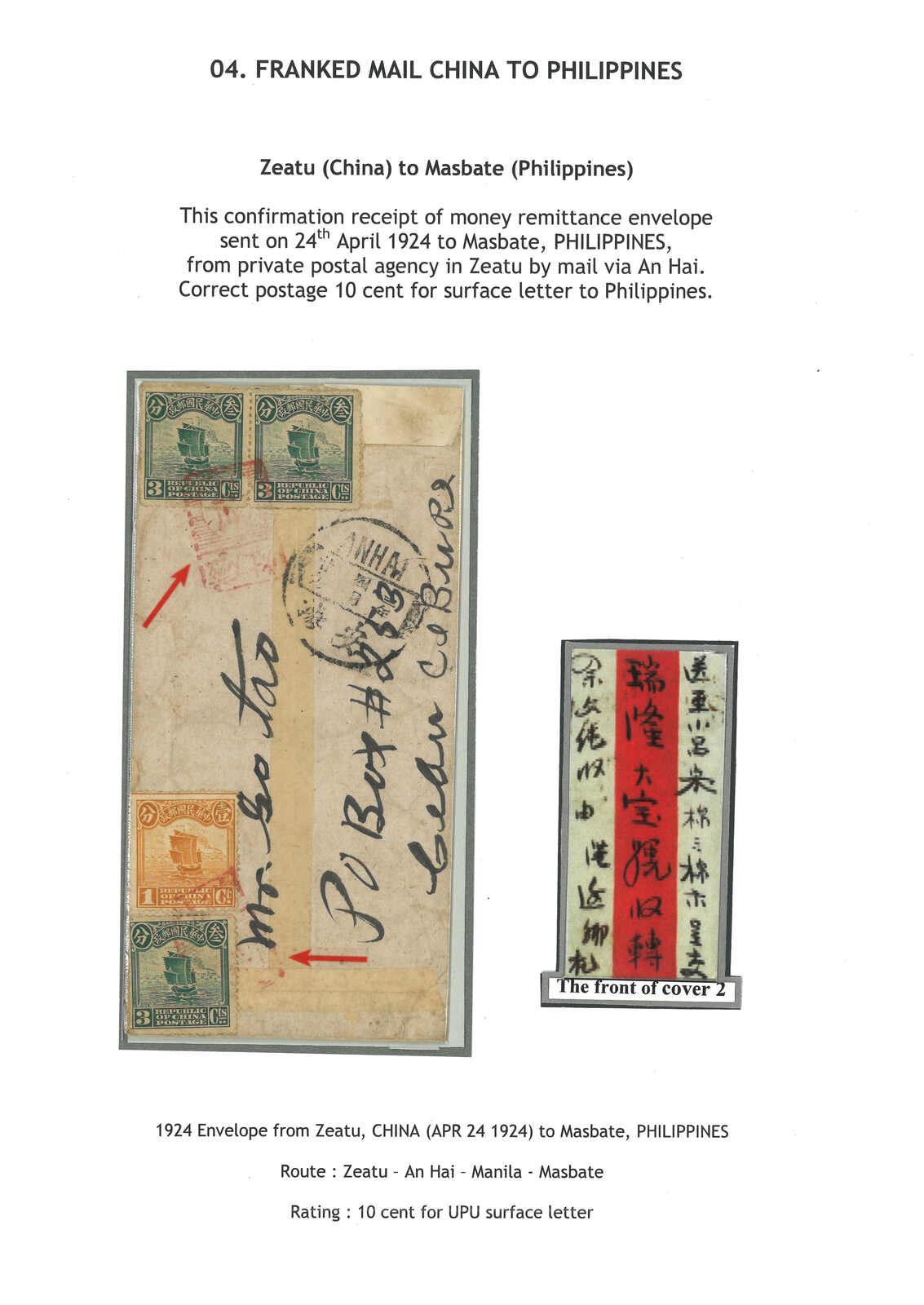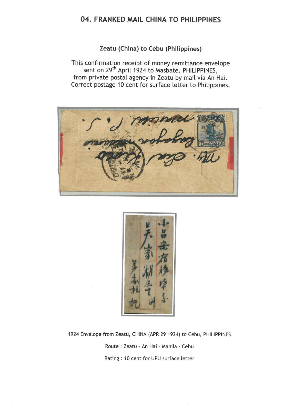 3980 cover image1924 (24 Apr) Huipi (receipt of remittance) red band cover from Tzetsao to Cebu, Philippines, f.w. Junk x4, in total of 10c international letter rate, tied by Tzetsao tombstone cancel. Transit Anhai (29 Apr). Although franking still was not required on Huipi by that time, this Huipi was franked with stamps which indicated that franking was optional for Qiaopiju.
