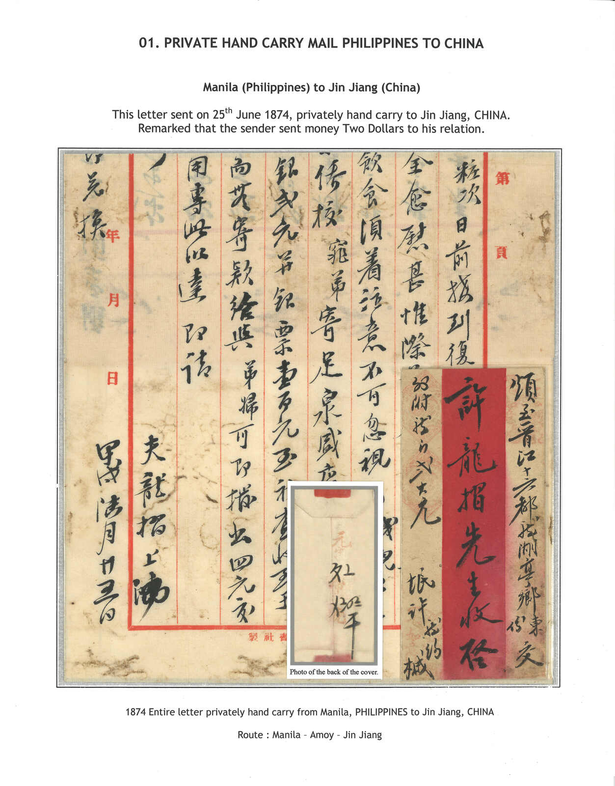 3975 cover image1874 (25 Jun) Qiaopi (money remittance letter) red band cover from Manila to Tsinkiang by courier, frankless, applied with courier vertical handfilled h.s. Showing amount of $2 on front. Scarce early example of Qiaopi from Philippines. With original letter.