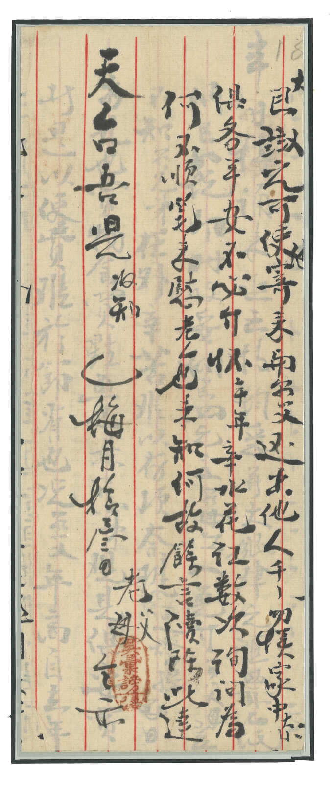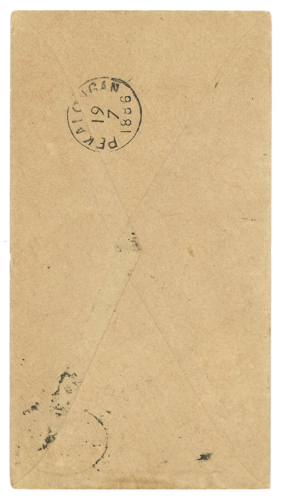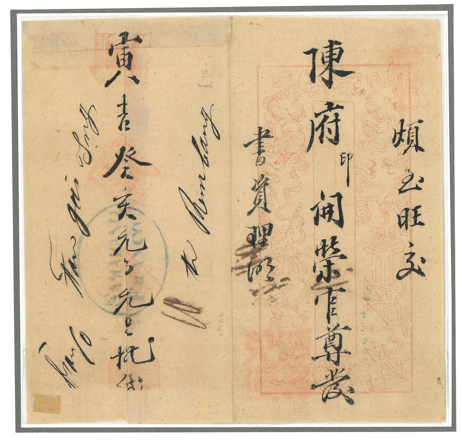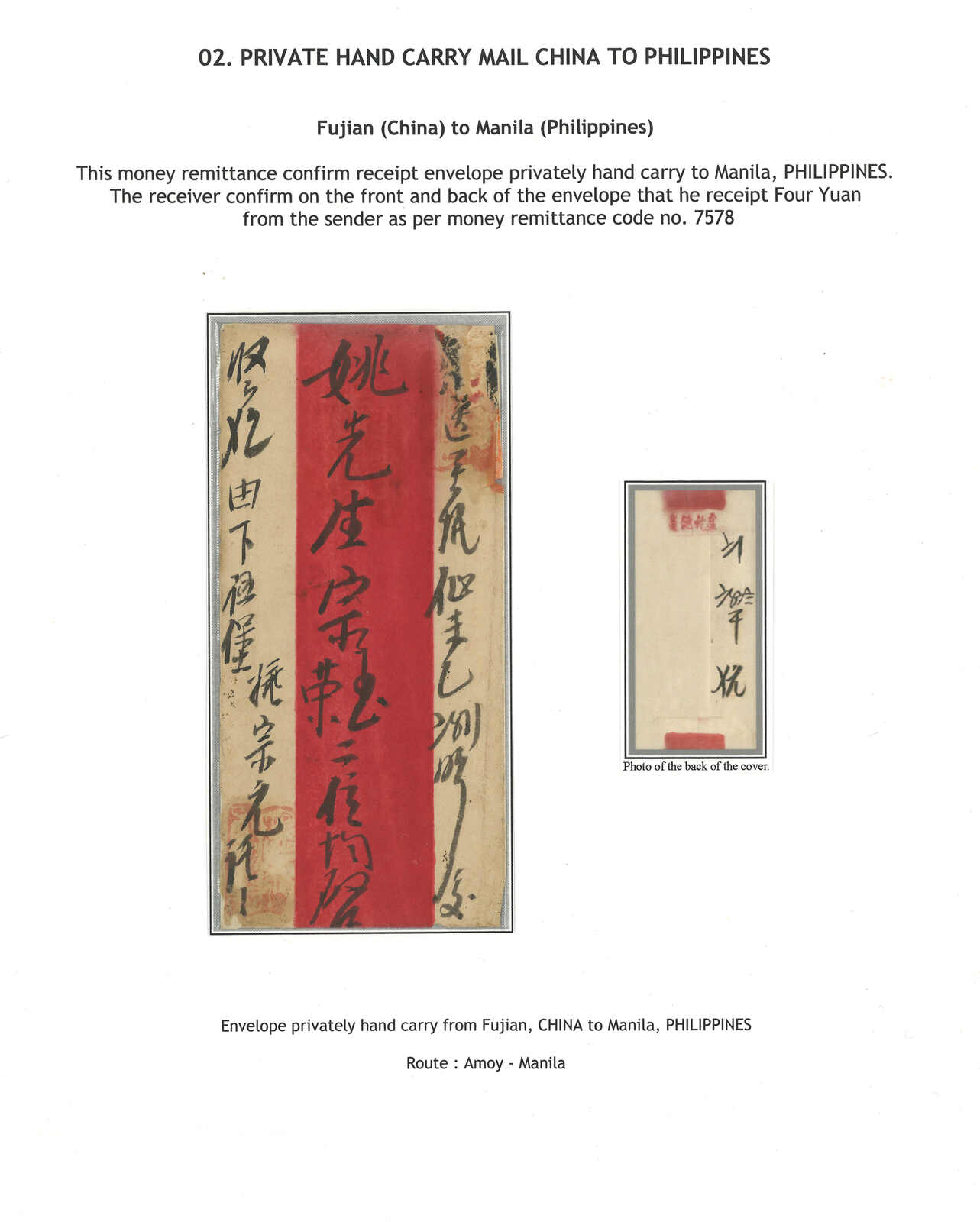 3973 cover imageca 1880s Huipi(receipt of remittance) red band cover Fukien to Manila by courier, frankless, with courier manuscript on reverse. Scarce early example of Huipi to Philippines.