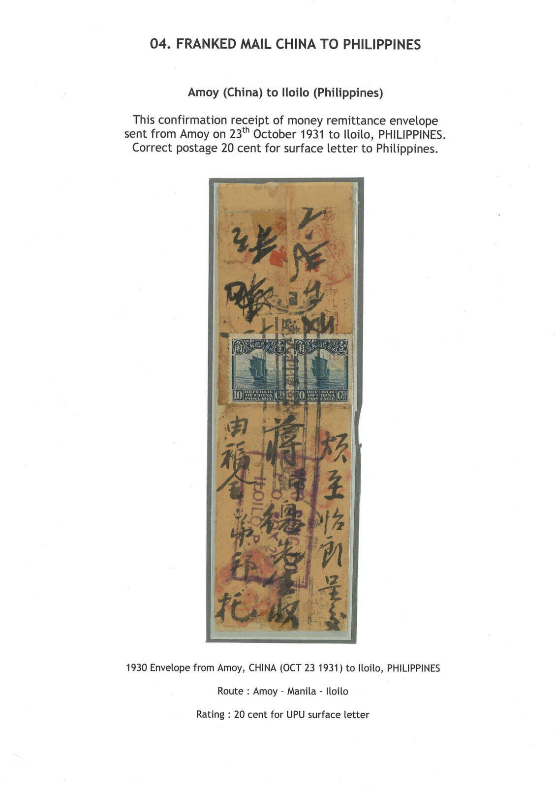 3987 cover image1930 (23 Oct) Huipi (receipt of remittance) from Amoy to Iloilo, Philippines, f.w. Junk 10c in pair, tied by Amoy slogan d.s.. Transit Manila. Arrived Iloilo. Scarce Huipi to Iloilo.