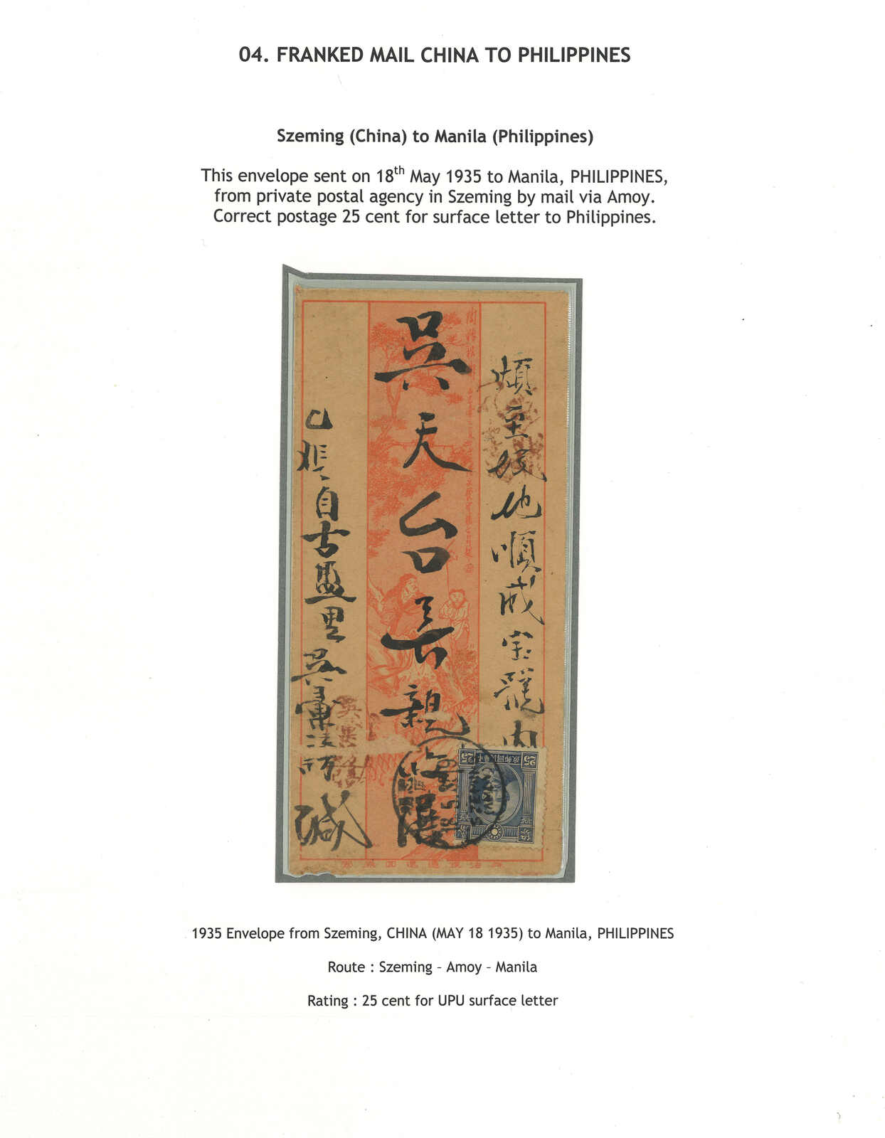 4000 cover image1935 (18 May) Huipi (receipt of remittance) from Szeming to Manila, f.w. SYS 25c, tied by Szeming bilingual cds. Since 1927, Filipino Post required that all Qiaopi must be franked with stamps. Chunghwa Post followed suit and Huipi therefore required to be franked with stamp.