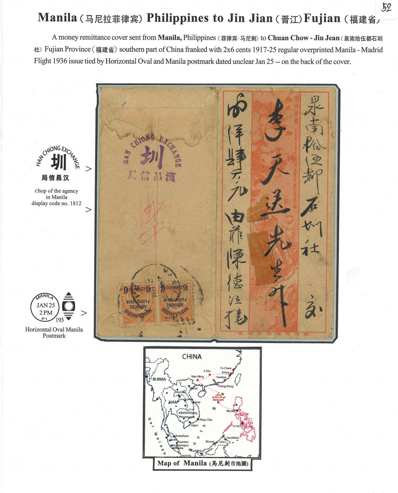 約1936年馬尼拉寄泉南。僑批紅條封,貼菲律賓票加蓋馬尼拉-馬德里航線6分蓋12分雙連,銷馬尼拉雙聯日戳,旁蓋漢昌信局戳記。寫有編號。封剖開以作展示。貼票少見。(Image 1)