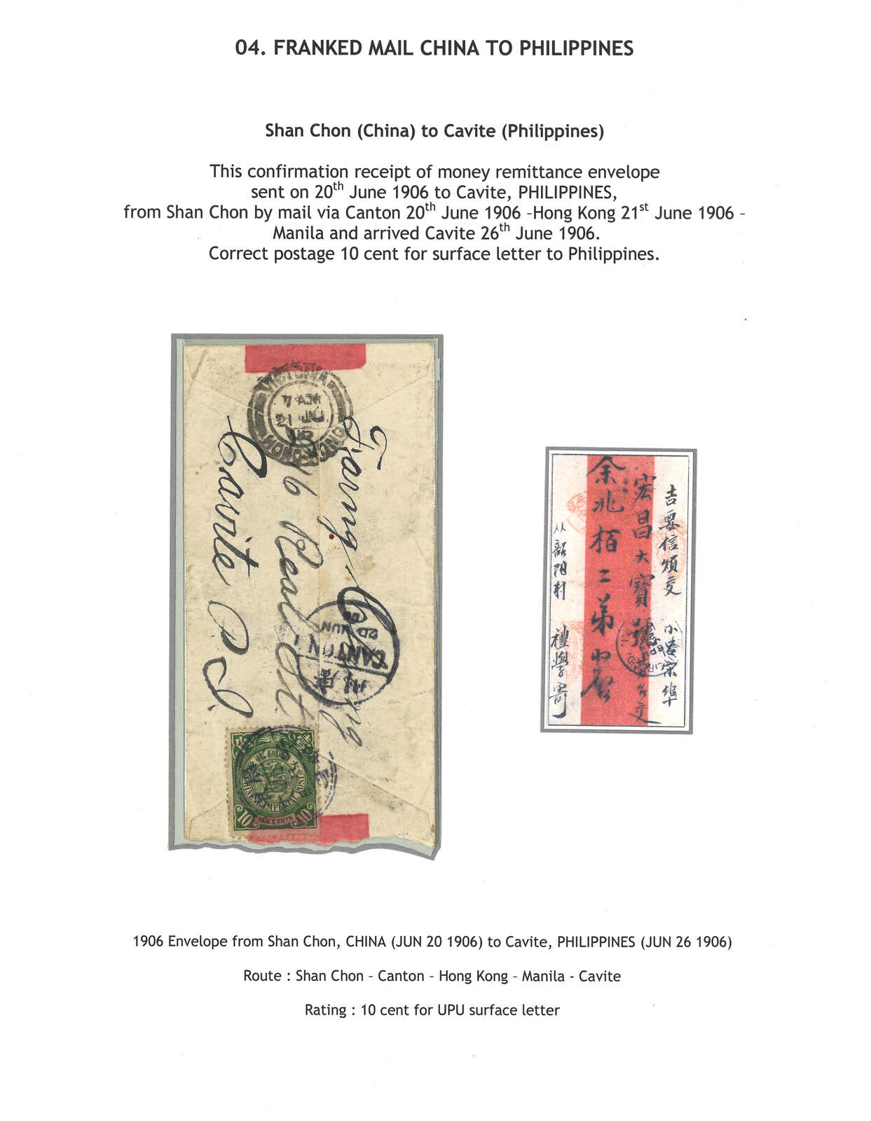 3976 cover image1906 Huipi (receipt of remittance) red band cover from Shiuyang to Cavite, Philippines, f.w. Coiling Dragon 10c on reverse, tied by Kwangtung Shiuyang lunar year cds. On front with Qiaopiju oval seal. Transit Canton (20 Jun), Hong Kong (21 Jun). Arrived Cavite (26 Jun). Cover opened at top. Scarce Huipi example to Philippines via Imperial Post.