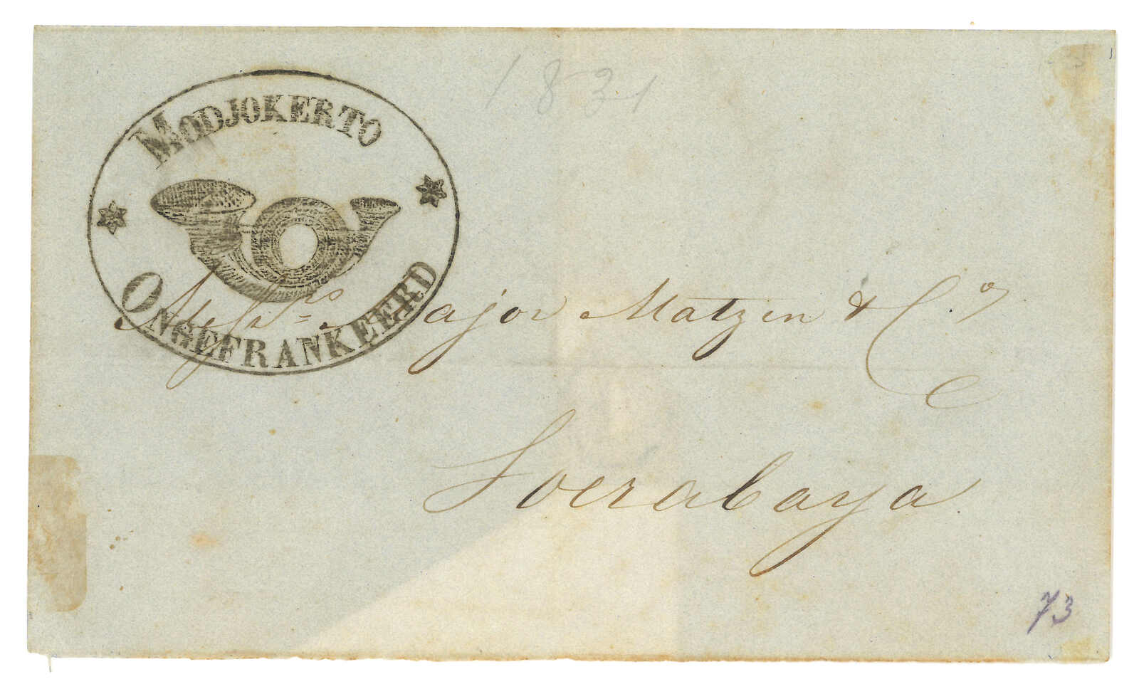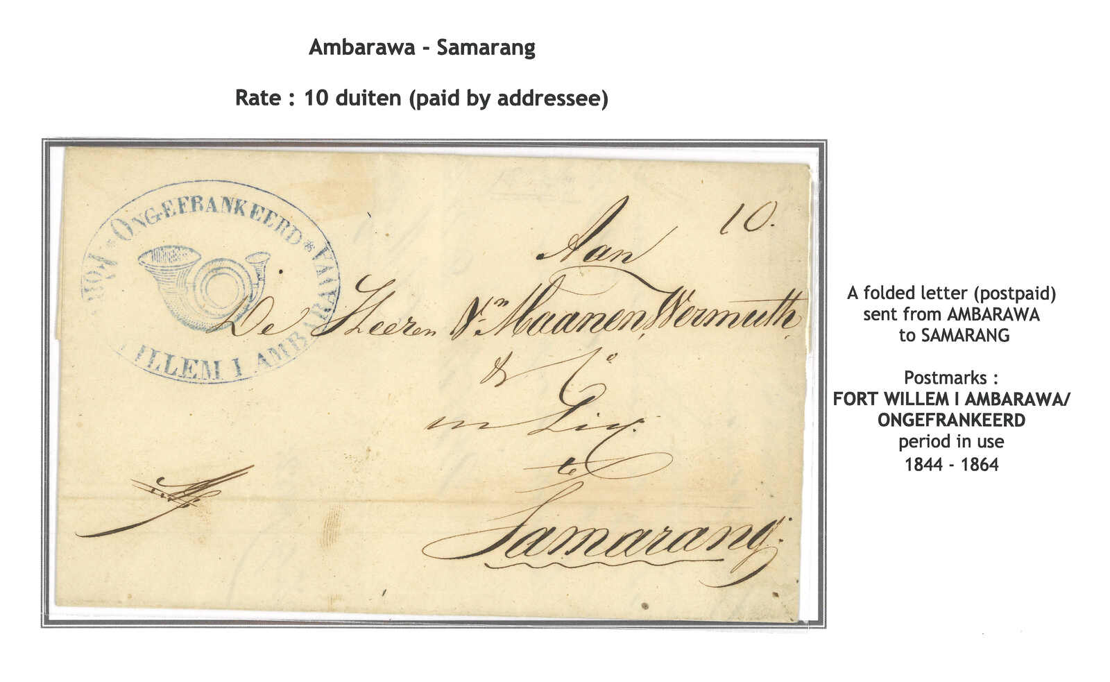 3844 image1850s a group of 3 Dutch East Indies domestic entires, sending from Soerabaja or Ambarawa, with postage manuscript or oval “ONGEFRANKEERD” postmark.