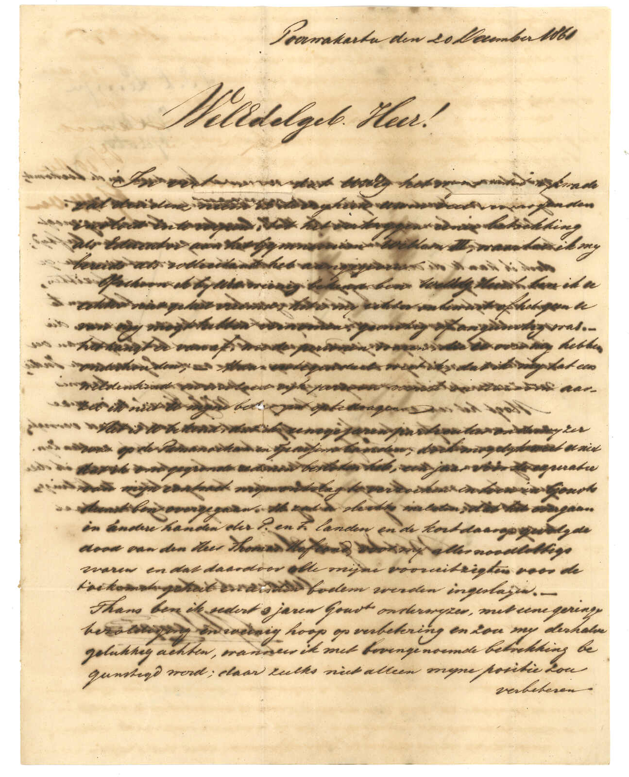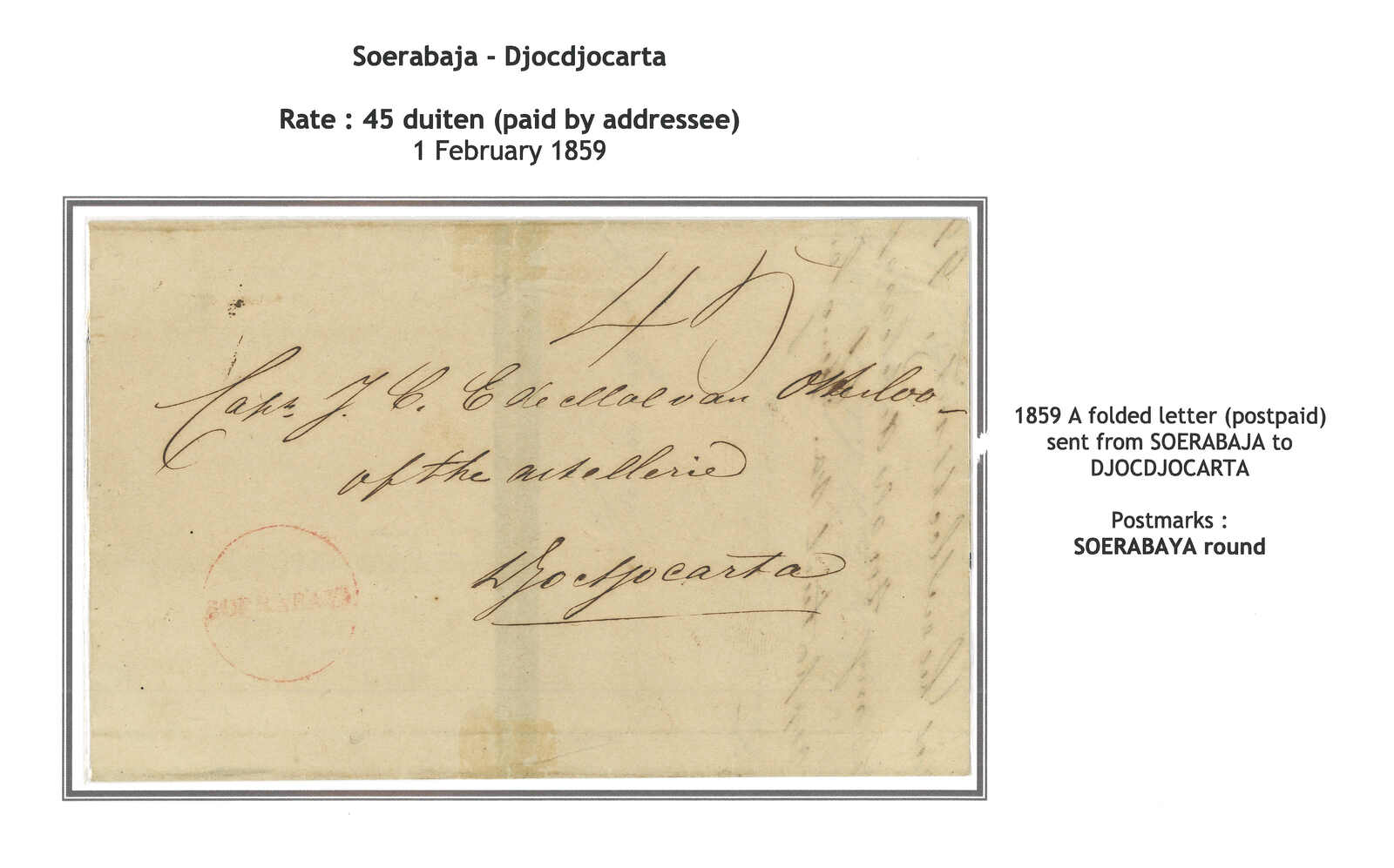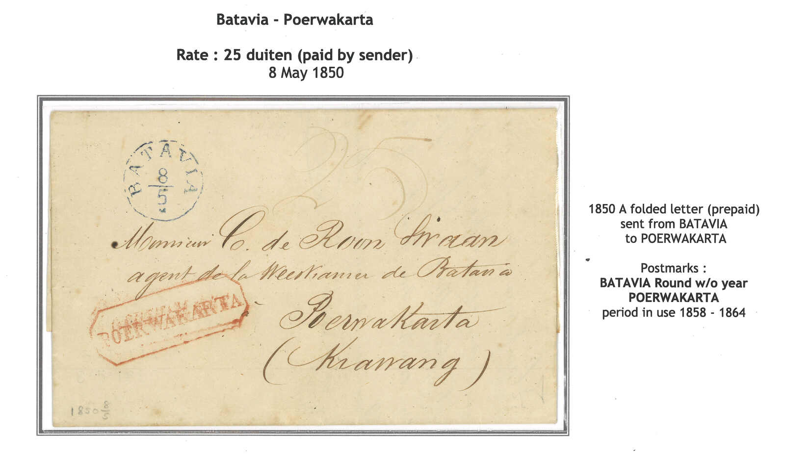 1850及1860年一對由巴達維亞寄Poerwakarta郵簡,寫有郵資,鈐“POERWAKARTA”橫戳。(Image 1) (Image 2) (Image 3)