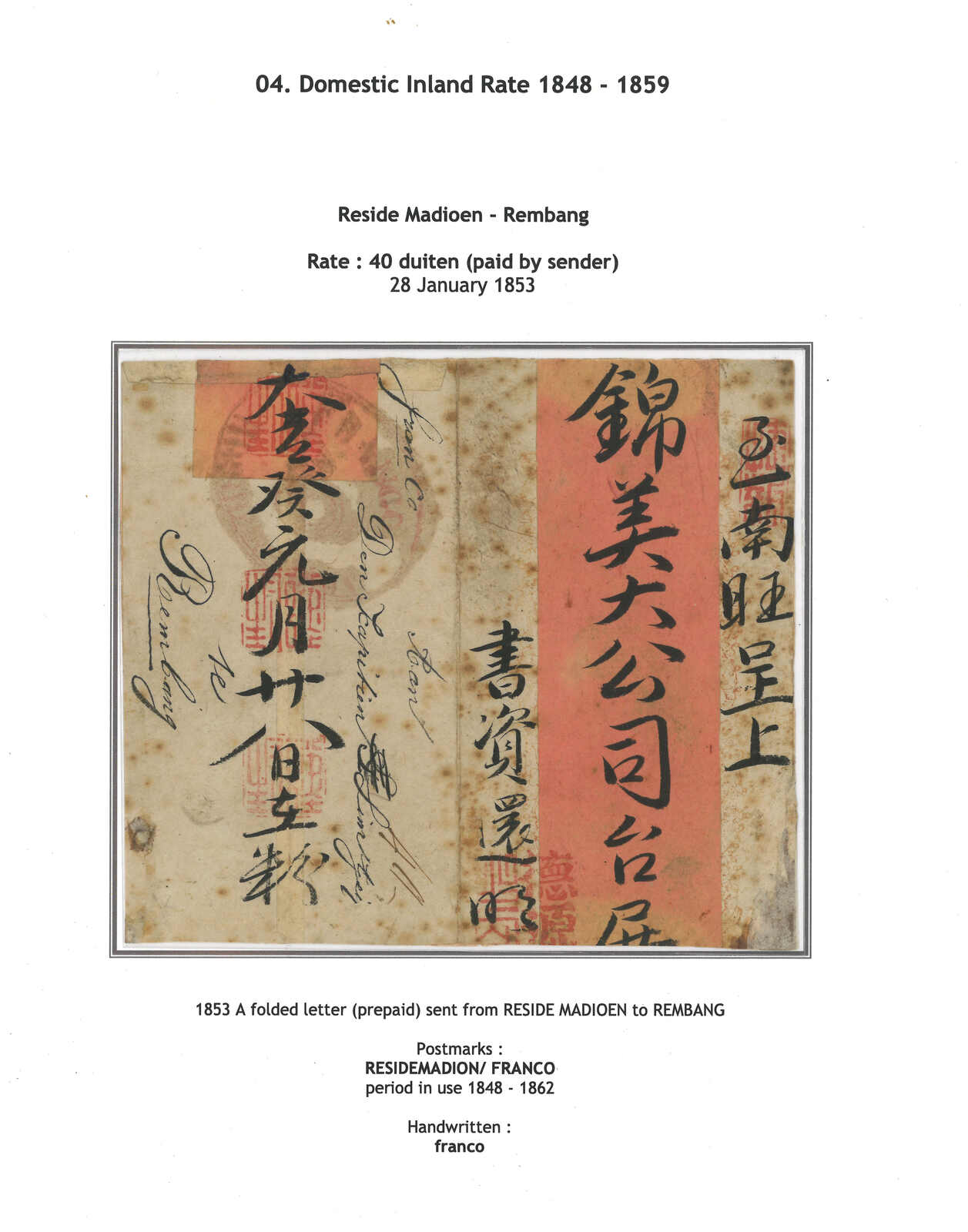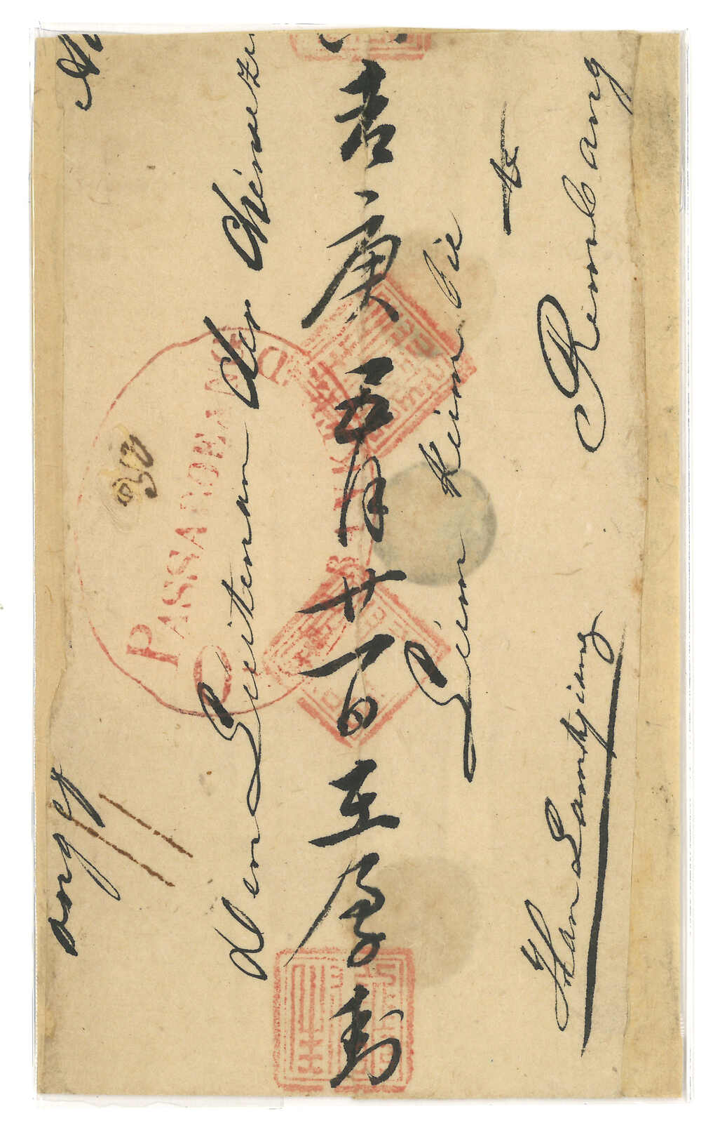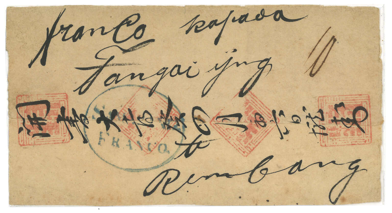 3849 image1860s a group of 3 Dutch East Indies Qiaopi bulk mail covers, from Semarang and Passaroeang to Rembang, with oval “FRANCO” or “ONGEFRANKEERD” postmarks. Chinese immigrants living in the small towns had to remit the money to Rembang first where the Qiaopiju remitted to money to China. A nice group of early Qiaopi postal history.