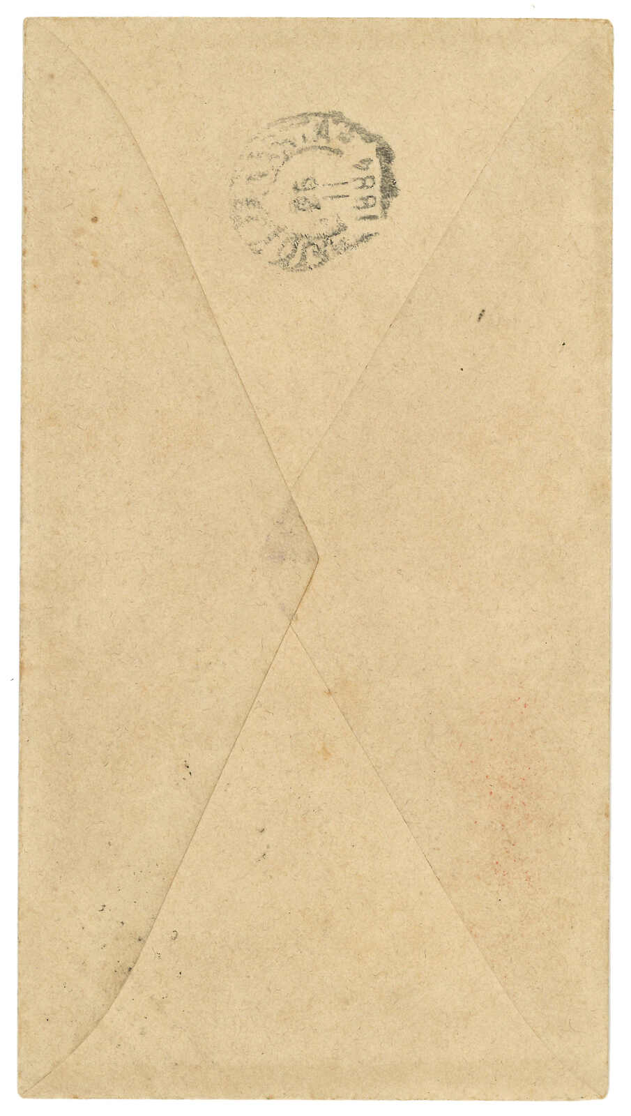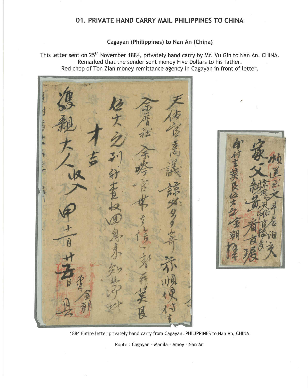 3974 cover image1884 Cagayan, Philipiness to Fukien. Qiaopi (money remittance letter) entire letter, frankless and carried by courier. The content mentions remittance amount 5 dollars and courier tombstone cancel. Scarce early example of Qiaopi in Philipiness.
