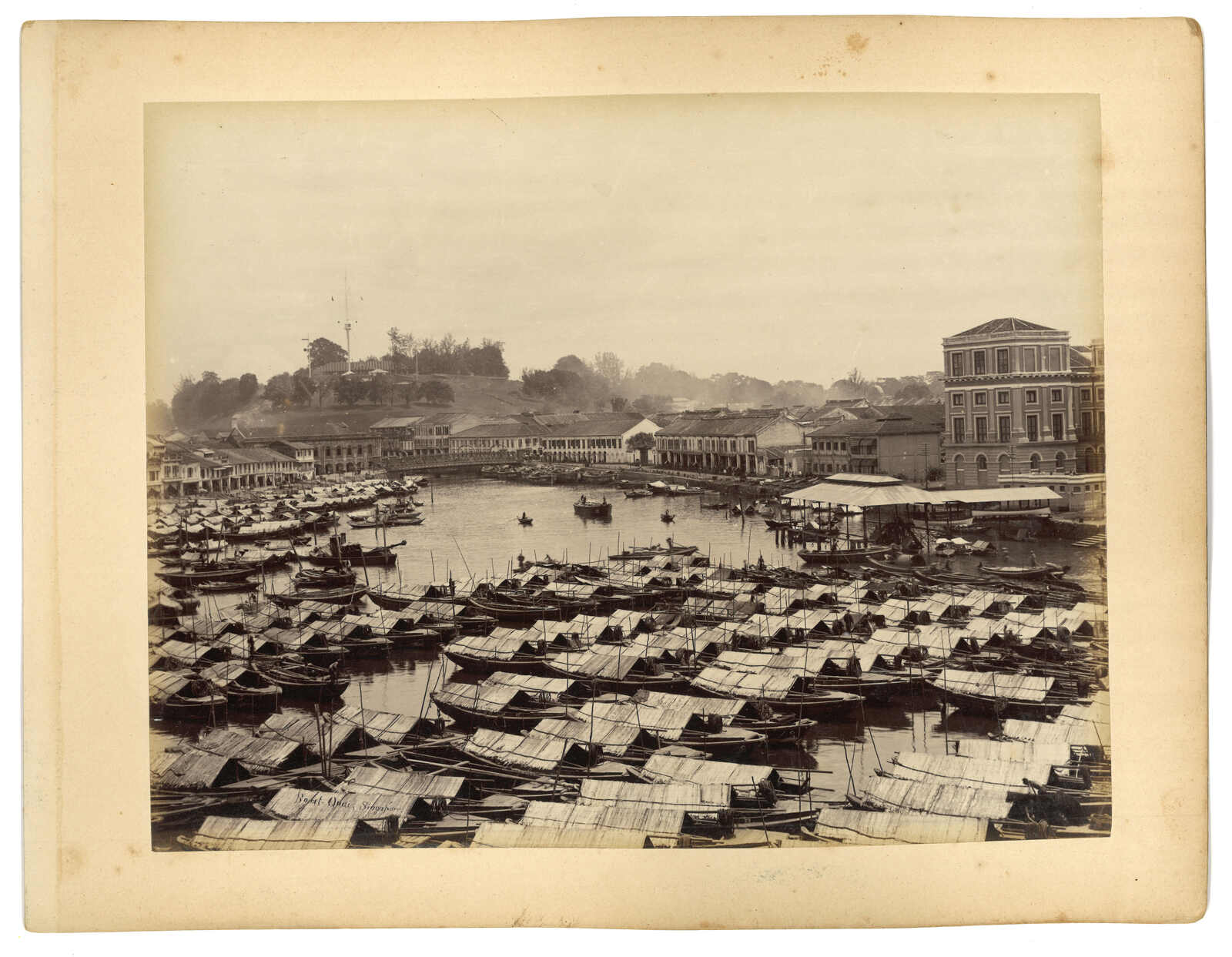 A group of 4 Singapore photos mounted double-sided on two stockcards (26 x 34 cm), showing Chinese temple, city view and indigenous woman.