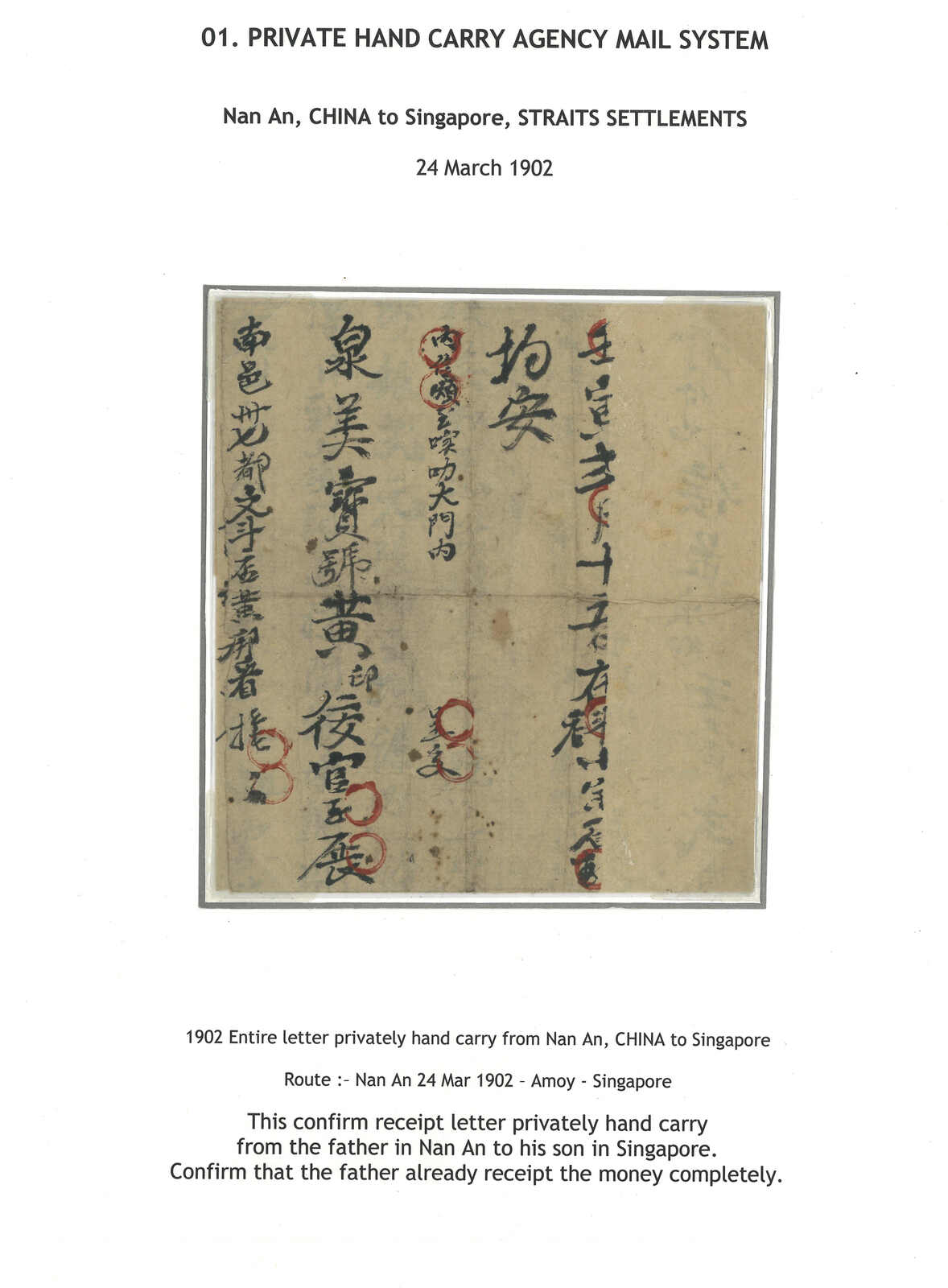 1902 (24 Mar) Huipi (receipt of remittance) from Nanan to Singapore, sent by courier but no postmark or manuscript of the courier was noted. Scarce early Huipi to Singapore.
