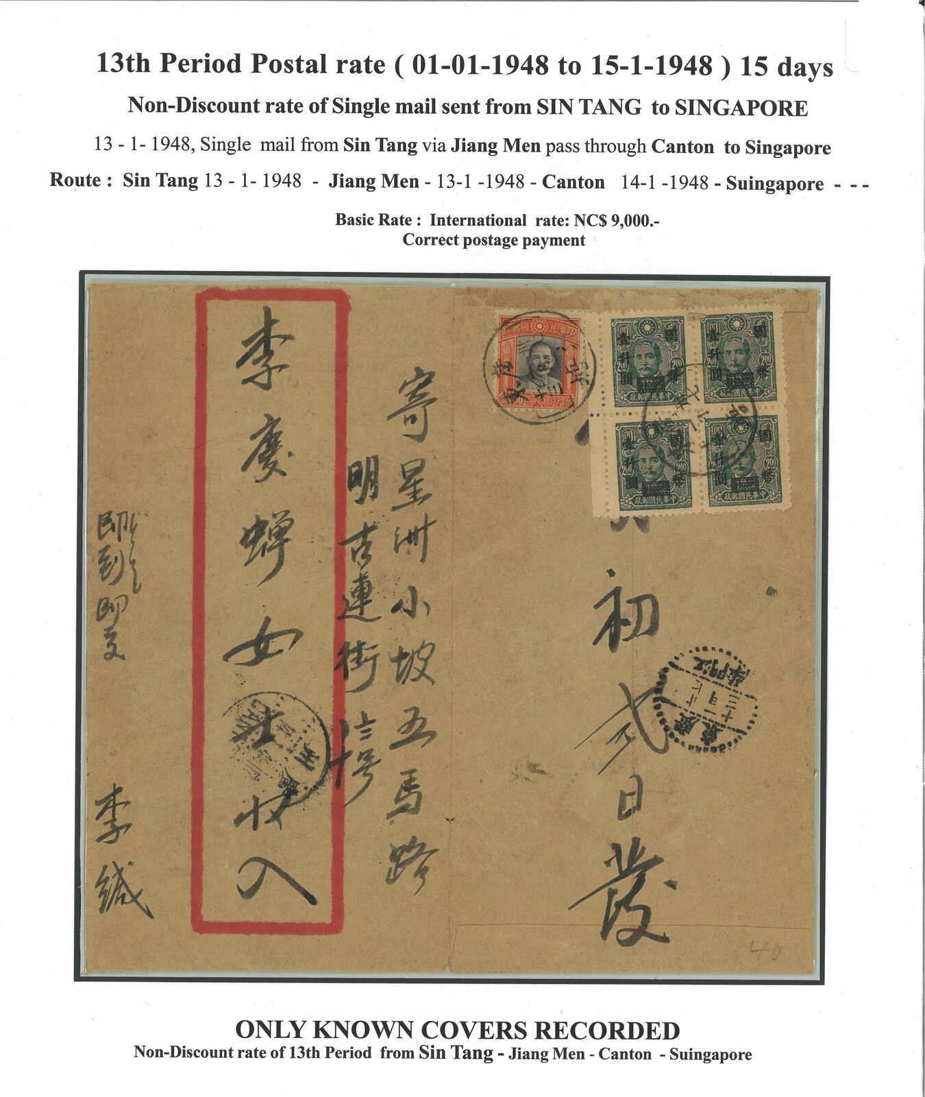1948.1.13 新塘寄新加坡,背貼孫像 + 孫像改值國幣票9000元,銷廣東新塘腰框日戳。1.13經江門,1.14經廣州。封剖開以作展示。此郵資僅於1948年1月1日至15日間,故十分少見難得。(Image 1)
