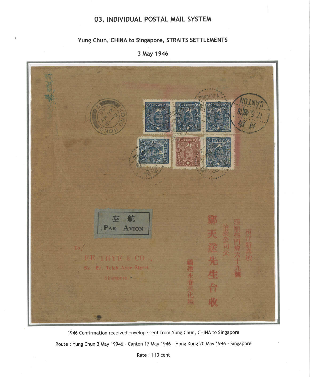 1946 Yungchun (3 May) to Singapore, f.w. SYS x6 on reverse, in total of $110 (probably double international printed matter rate + airmail rate) tied by Yungchun bilingual cds. Transit Canton (17 May), Hong Kong (20 May). First