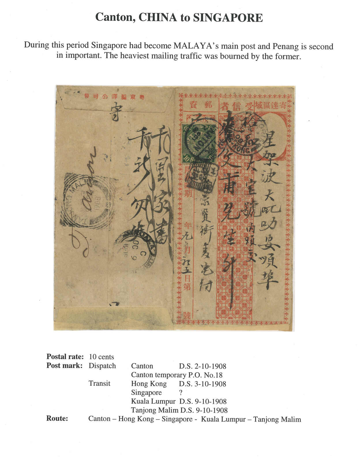 1908 Canton (2 Oct) to Singapore, f.w. Coiling Dragon 10c, tied by Canton No. 18 tombstone cancel and Canton bisected bilingual cds. Transit Hong Kong (3 Oct), Kuala Lumpur (9 Oct), Tanjong Malim (9 Oct). Cover opened out for