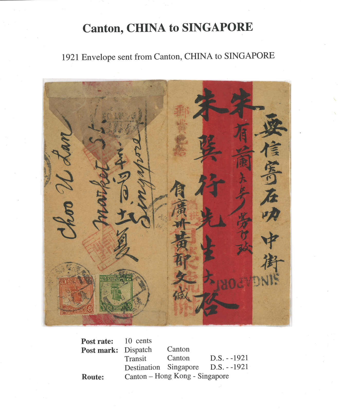 1921 Huipi (receipt of remittance) red band cover from Canton to Singapore, f.w. Junk 2c + 8c on reverse, tied by Canton bilingual cds. Arrived Singapore. Scarce. Cover opened out for display.